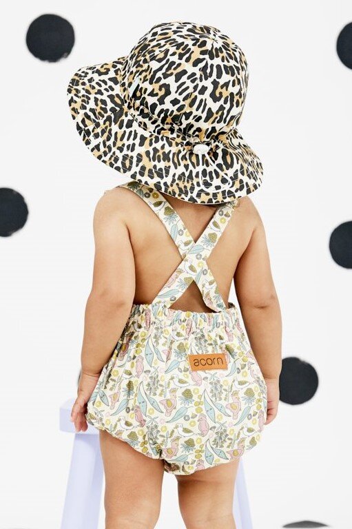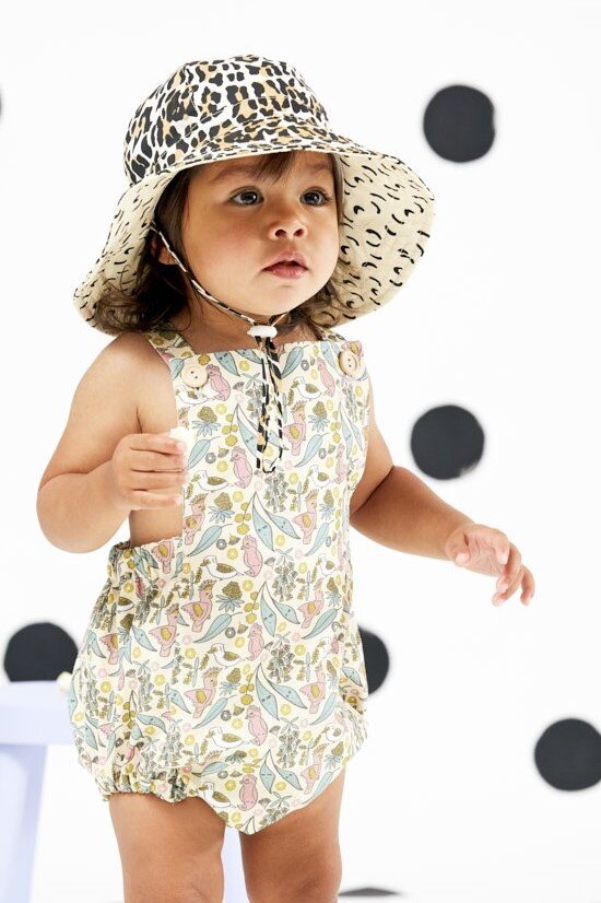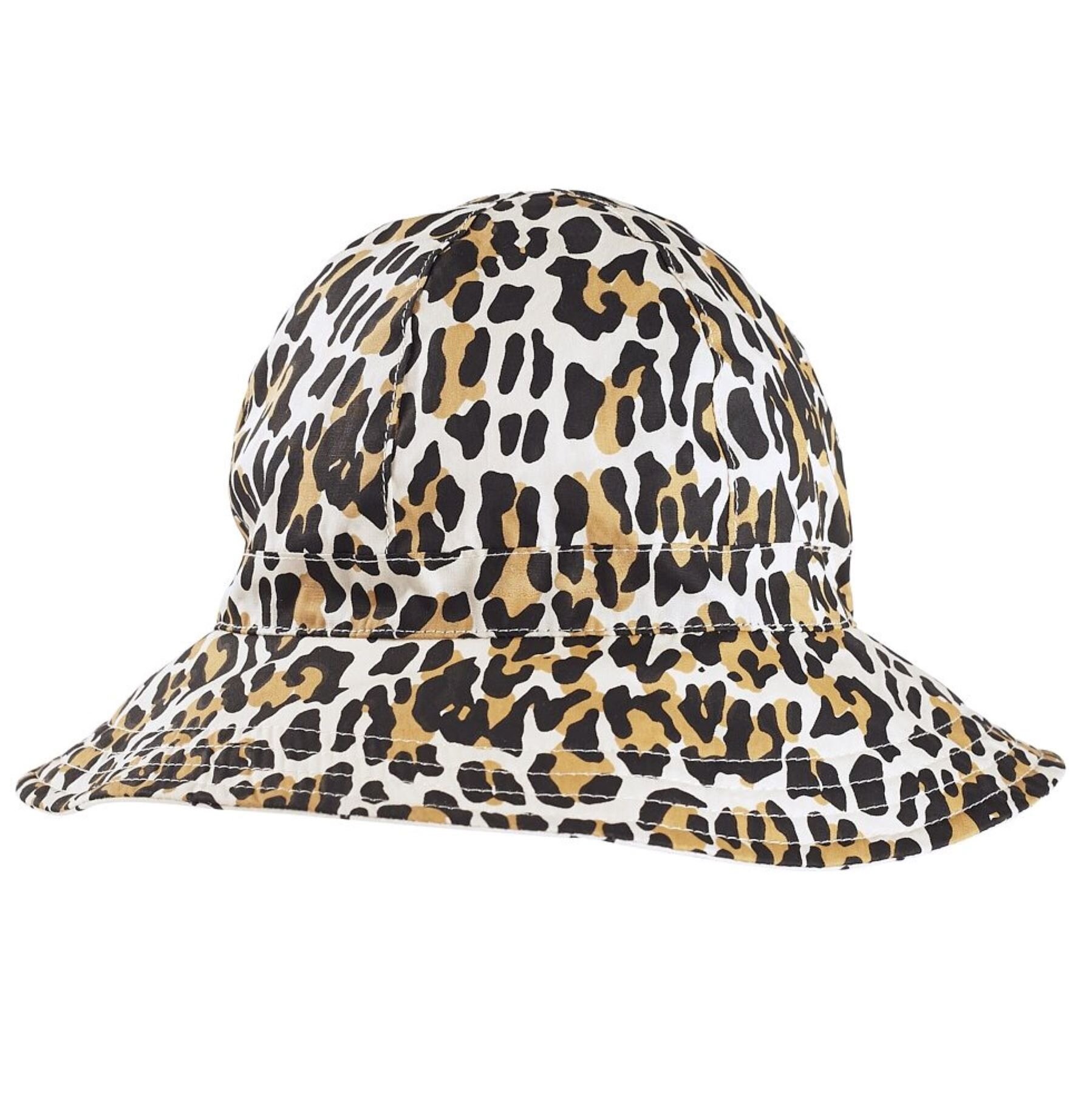 Floppy hat with a cream, tan and black leopard print on the outside and a cream and black dashes print on the inner brim.