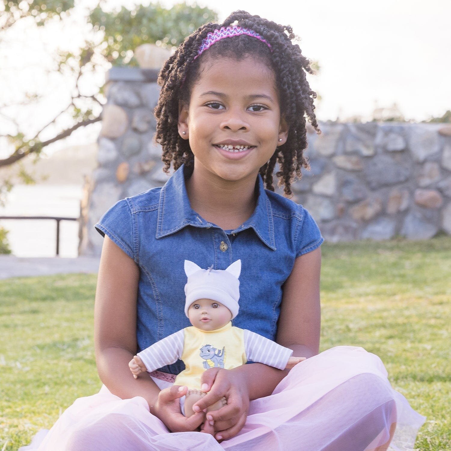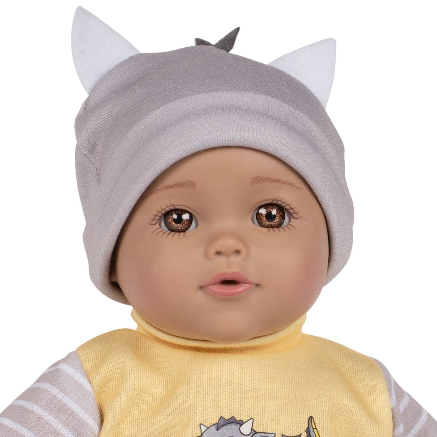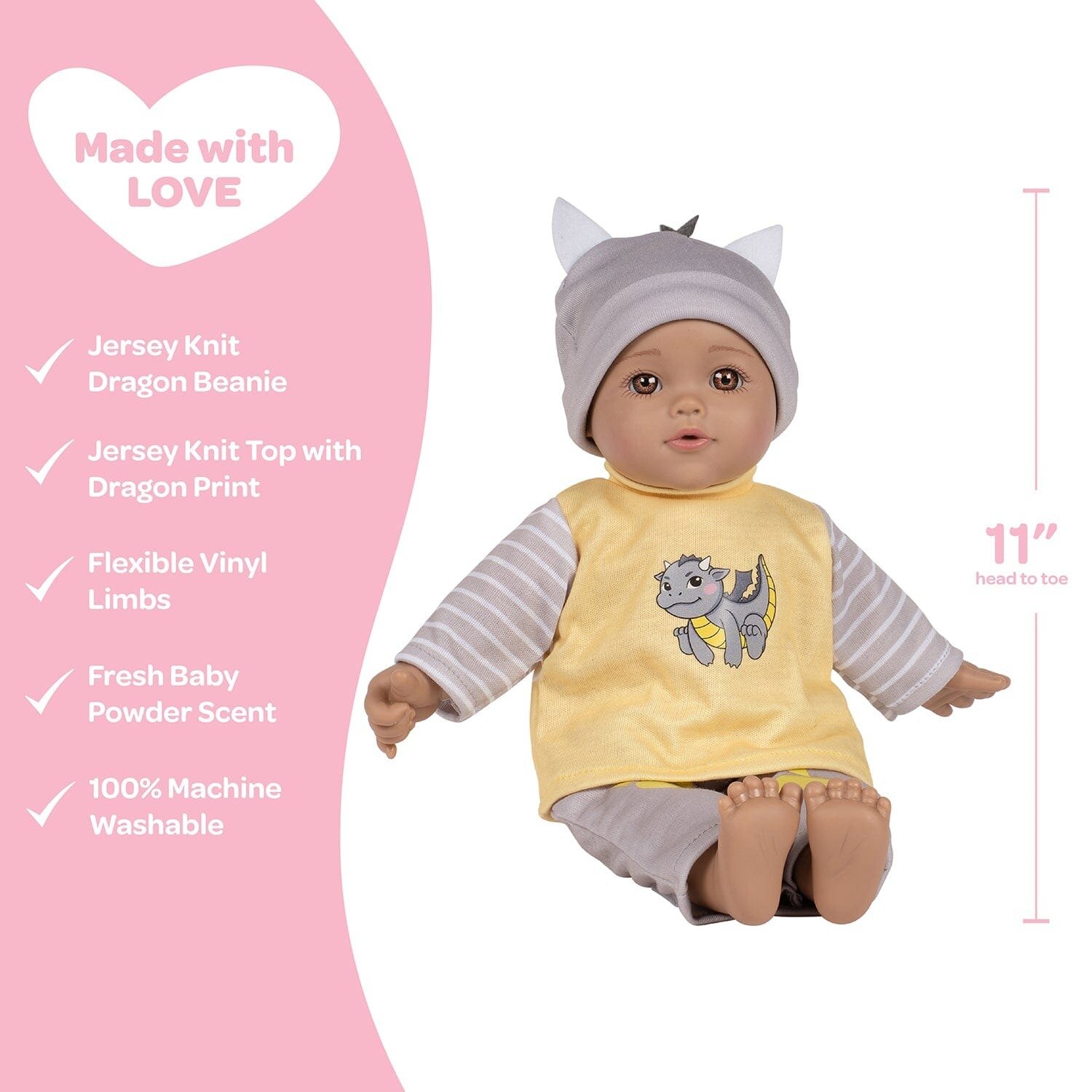 Adora’s Little Love Baby Cutie Dragon is ready to take you and your toddler on a magical dragon ride featuring his cute animal-themed ensemble! This gender-neutral baby soft play doll comes dressed in a grey and yellow jersey knit shirt with dragon print and coordinating grey pants. He/She looks fashionable in a matching grey beanie with 3D dragon ears and spine that covers his/her hand-painted brown hair. With those adorable brown eyes, squeezable cheeks, and open-mouthed baby lips, Cutie Dragon makes a perfect 1st baby doll for all the little boys and girls!