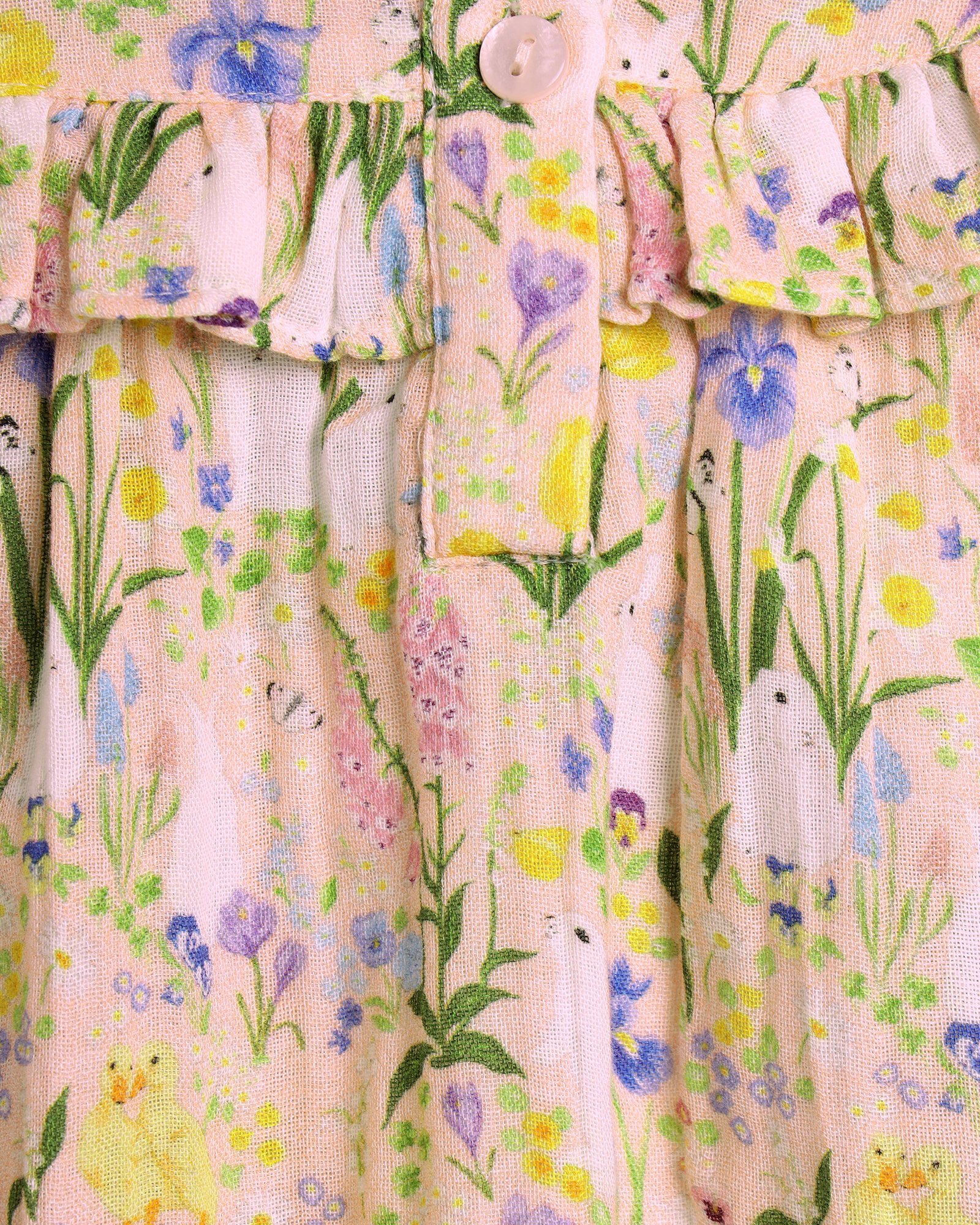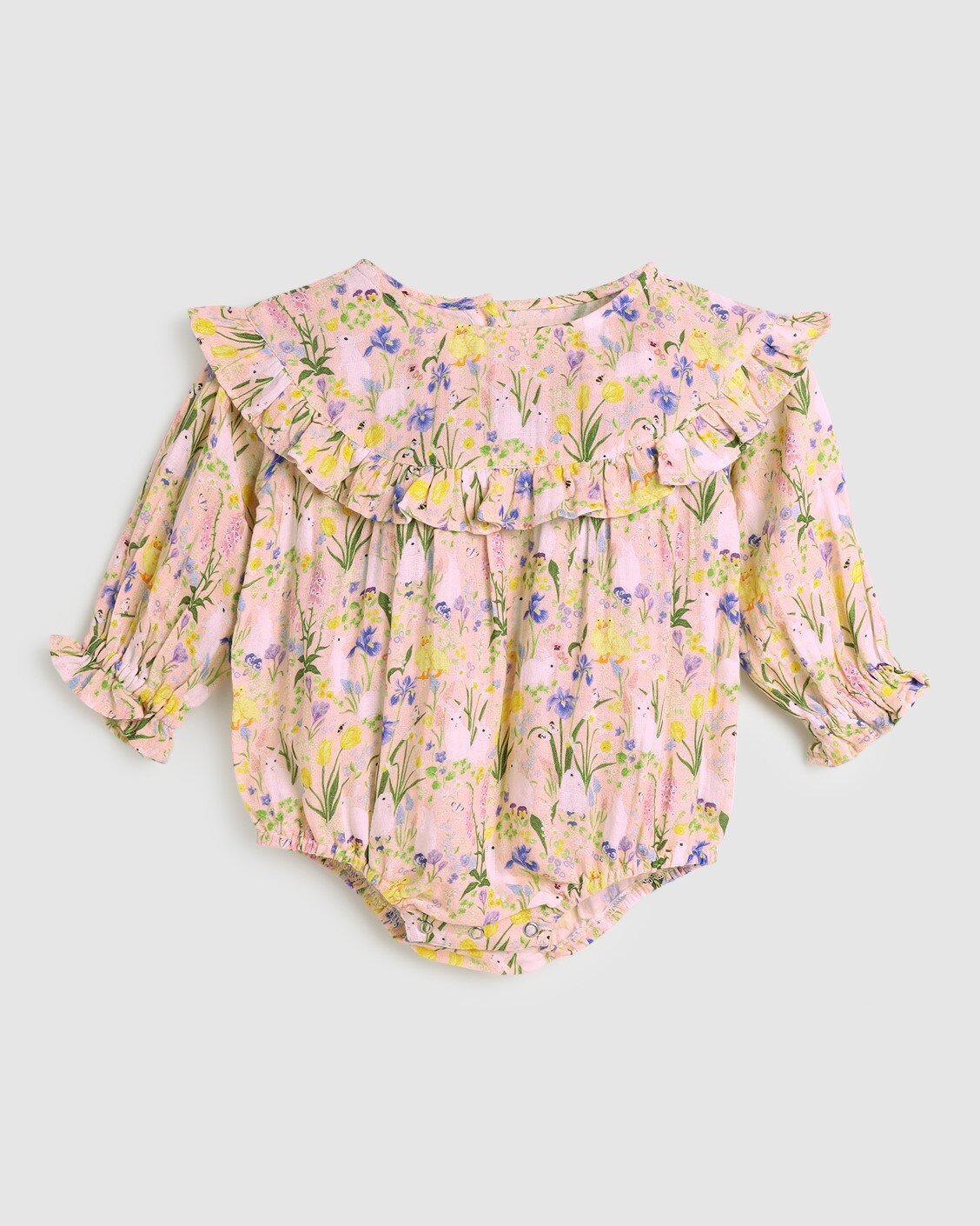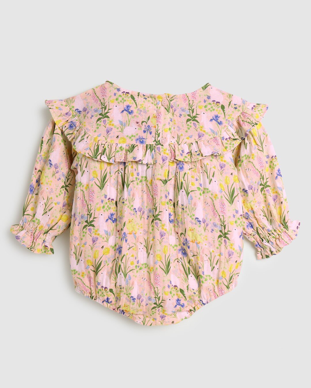 The Blossom Playsuit in Bunnies print features a gently gathered neckline and gorgeous ruffles with soft elastic at the wrists and ankles for a snug, comfortable fit. The adorable bunny fabric makes it a delightful choice for everyday wear.