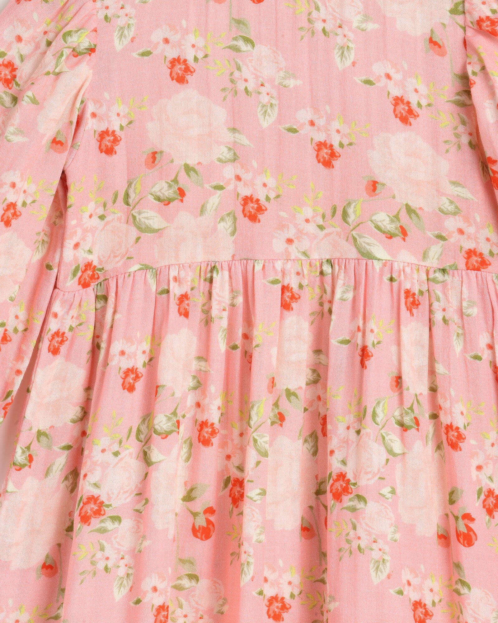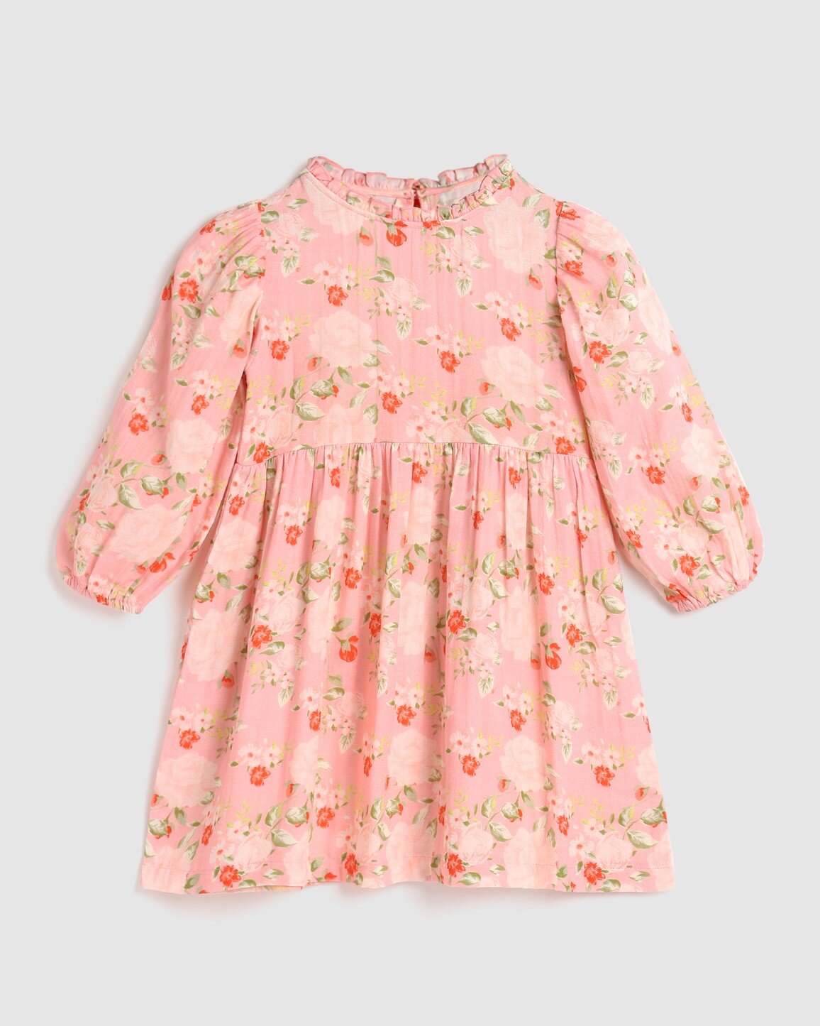 sleeves with a gathered elastic hem and a lightly gathered skirt. A soft frill trim runs delicately along the collar, creating an understated feminine look. It's the perfect everyday dress with a hint of special.