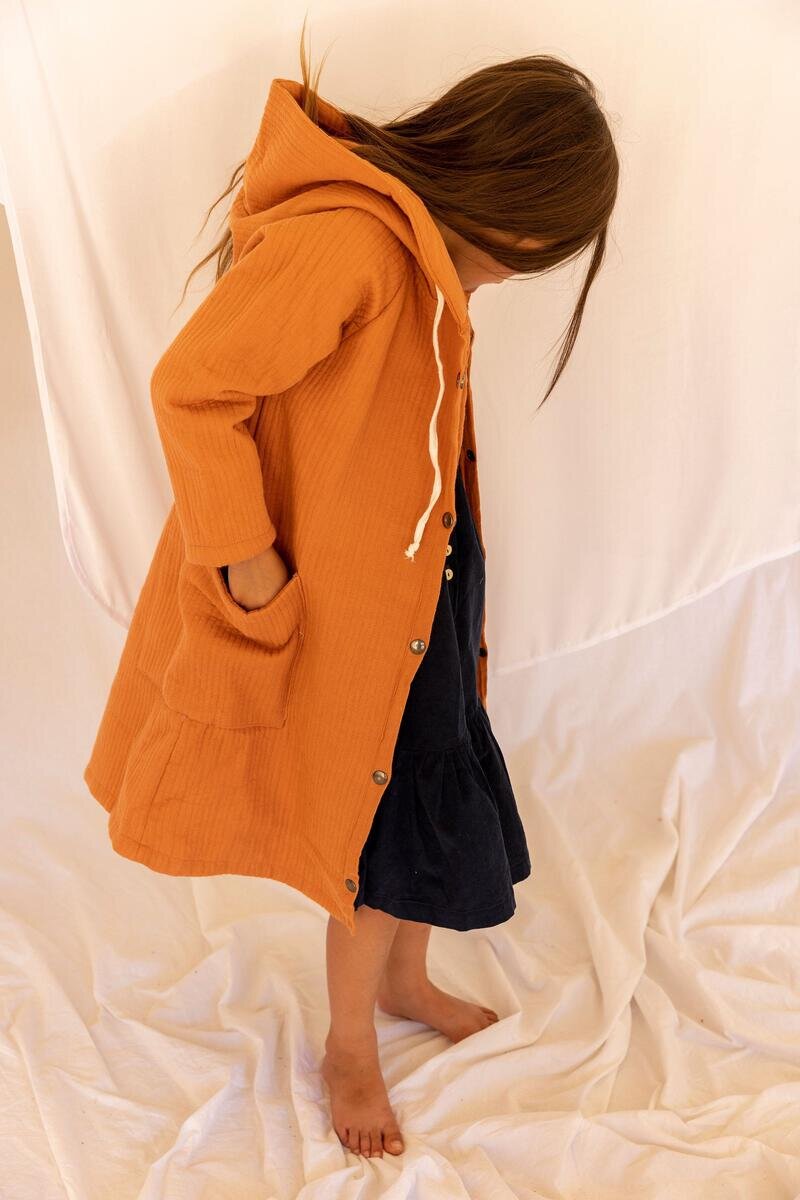Every girl needs a trench coat in their life, and this is the perfect piece to start with. Made from a gentle cotton gauze lightly padded for that extra warmth. The detail of this jacket is extra special, it has panels of stitching which are all done individually - each piece takes about 3 hours to complete. Big pockets for treasures, a hood for cold days and the little finishing touches of press studs and natural cord drawstring- WOW!!! so darling!