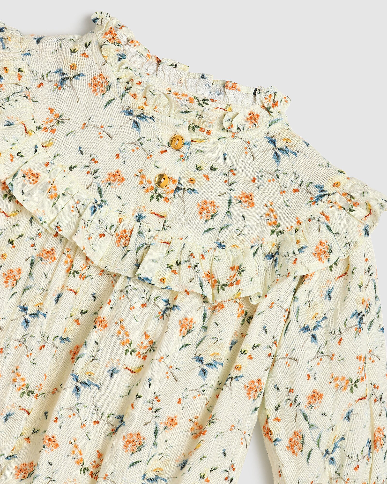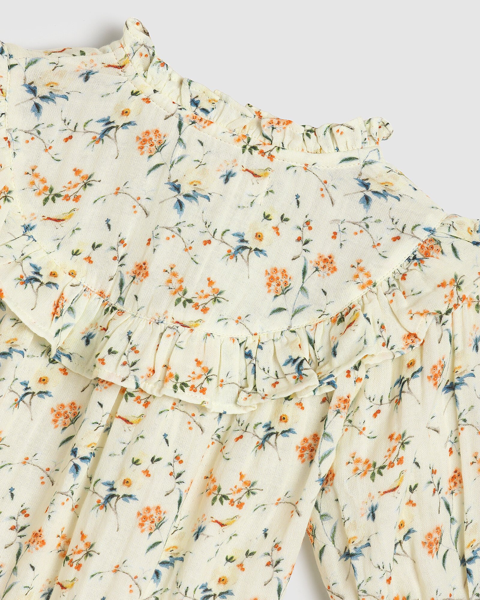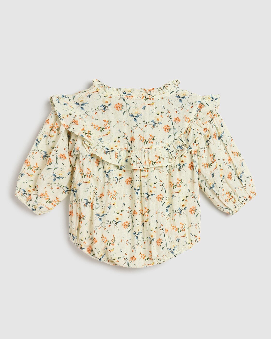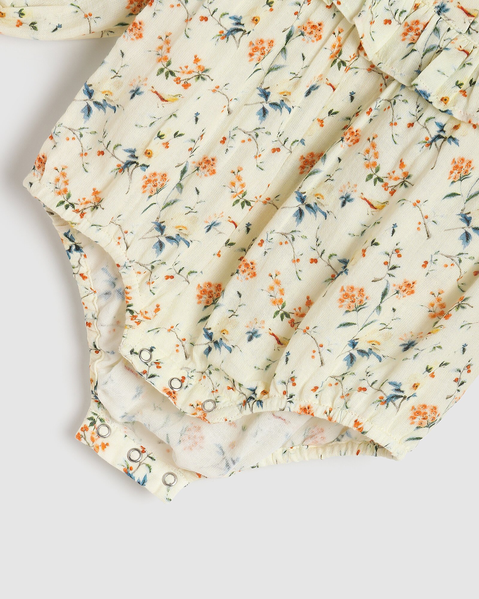The Valerie Playsuit in Natural Bird is a timeless piece, featuring a delicate ruffle collar and softly gathered yoke with two buttons to close. Its gentle puff sleeves and elasticated legs ensure comfort for all-day play.