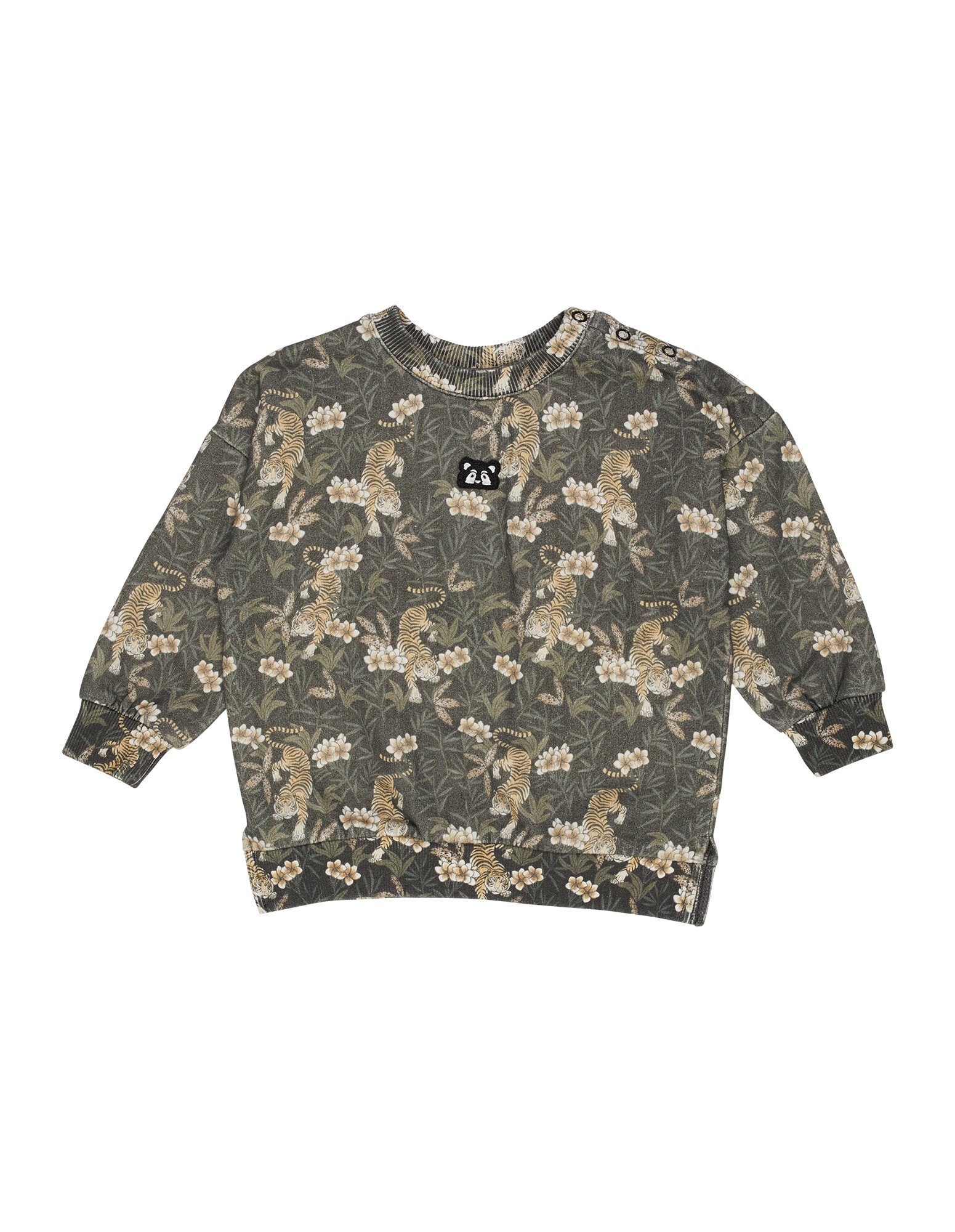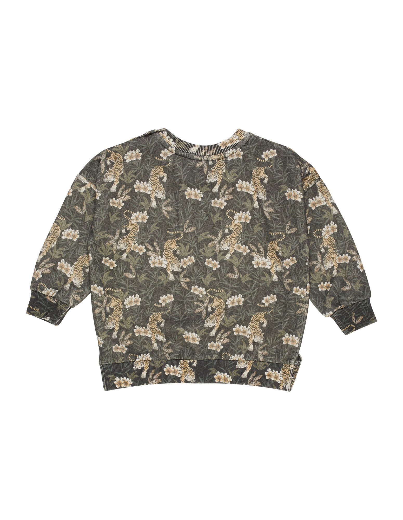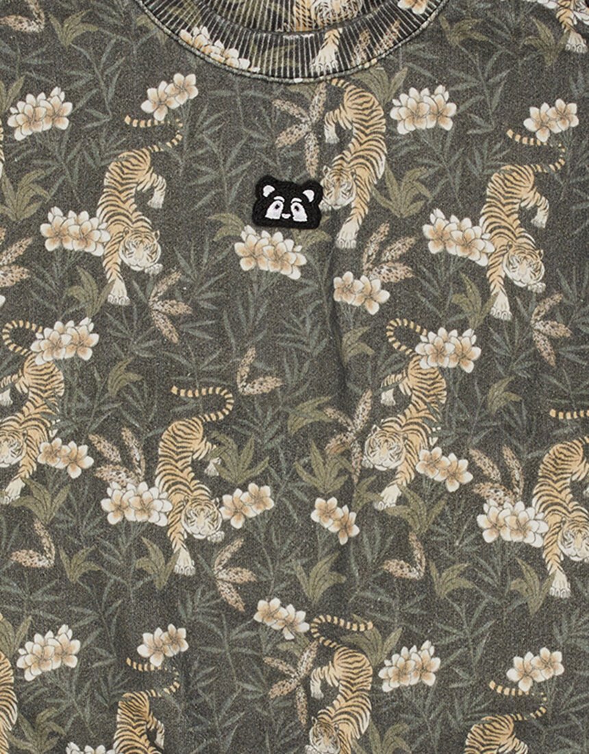 The Jungle Crew is made from 80% Cotton / 20% Polyester unbrushed fleece, in a regular shape with an all over wash for soft handfeel. The crew features an all over yardage print and a branded flag label attached in the side seam. The neck, cuffs and hem are finished with a fine 2x2 rib for stretch and comfort