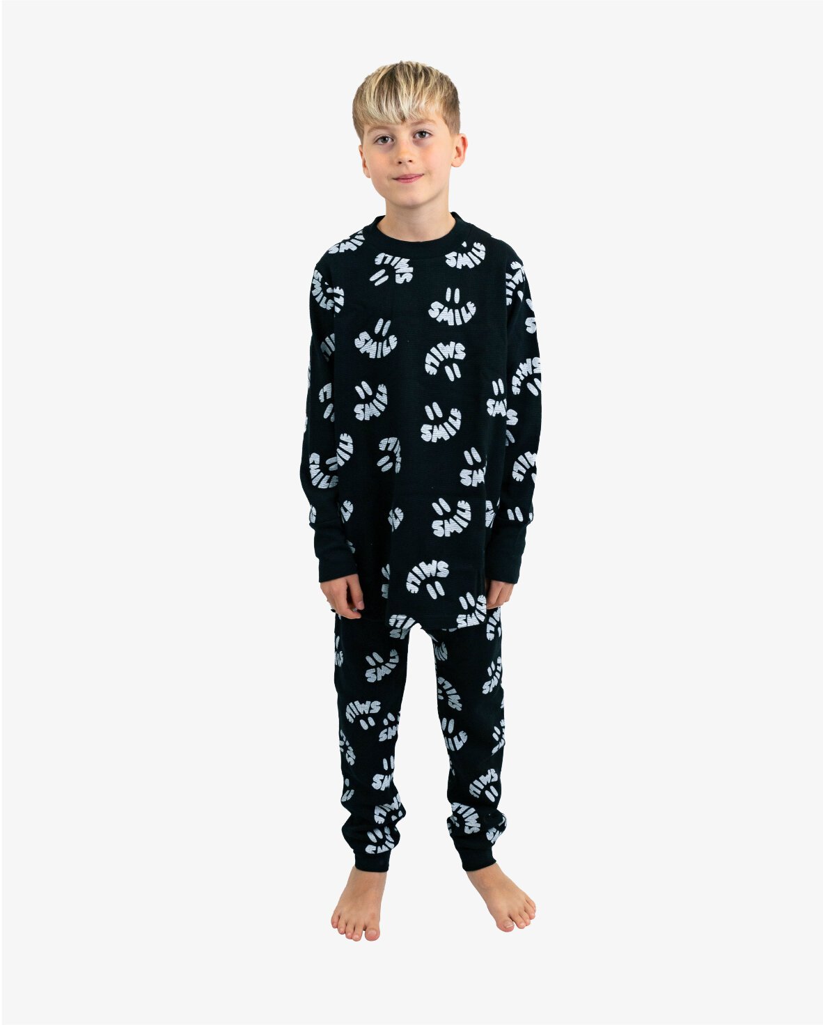 The Band of Boys Black Waffle Smile Winter pyjamas are a rad way to add some texture and edge to your minis night-time routine. These boys pyjamas are made of a waffle cotton, with a striped branded elastic waistband. Both the tee and pants have been made with a slightly slimmer fit to keep your minis as safe as possible at night against any fire risk. They come folded in a rad drawstring bag which makes them perfect for gifting. Madden is 140cm tall and wears a size 10.