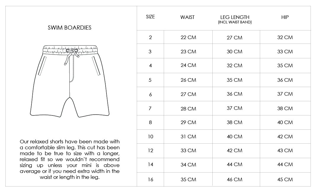 The Band of Boys Dino snake boardies are super fun and are perfect for hanging out in on those long beach days. These cool boys boardies have side and back pockets, a drawstring elastic waist, inside lining and are made from light weight, quick-drying, no-stretch recycled polyester fabric. These shorts have been made to fit true to size but note that there is no stretch in the fabric so size up if your mini is above average in size.