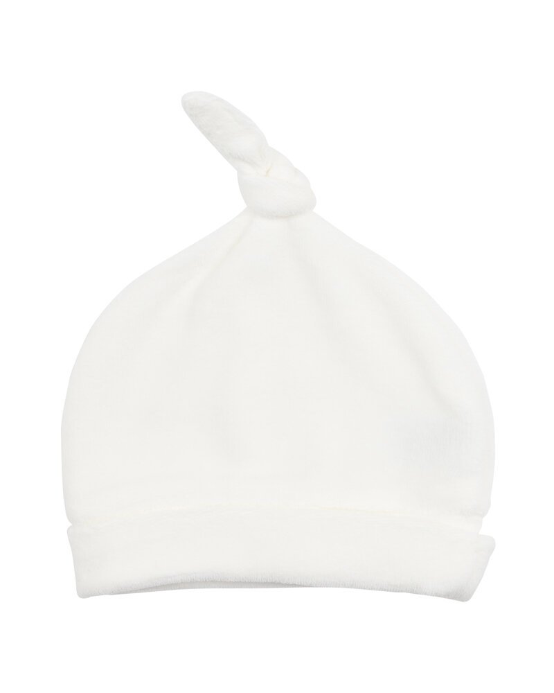 This cream velour beanie is the perfect accessory to keep your little one cosy this winter. Featuring an adjustable top knot detail, and made from an organic cotton blend, this sweet beanie can be paired with the Angus velour onesie for the perfect outfit.