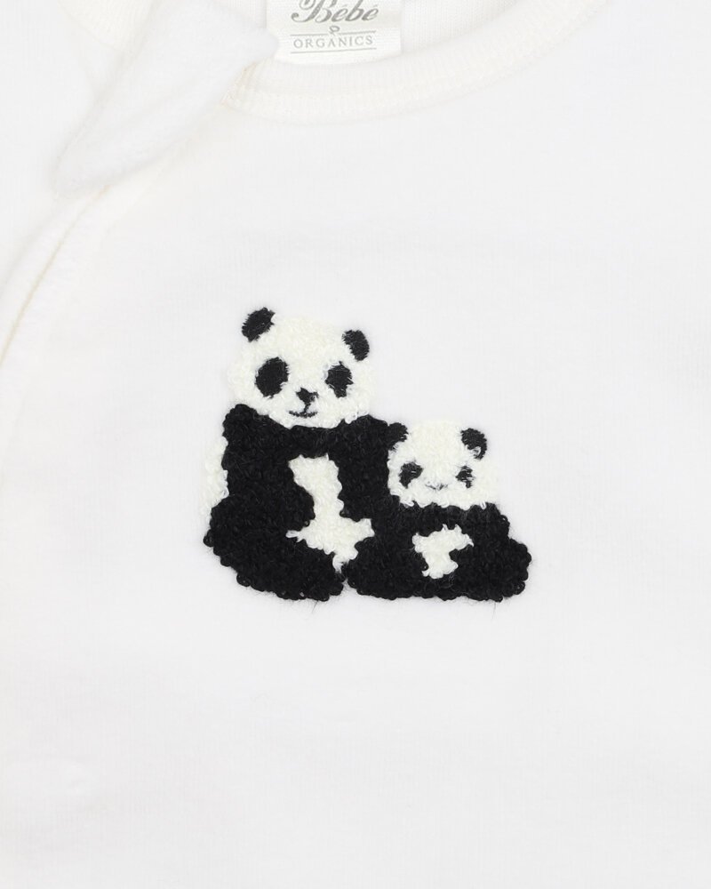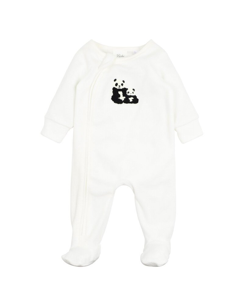 Warm and comfortable, this cream organic cotton blend velour romper features boucle sitting pandas embroidery on the front and front zip opening for ease of dressing your little one.
