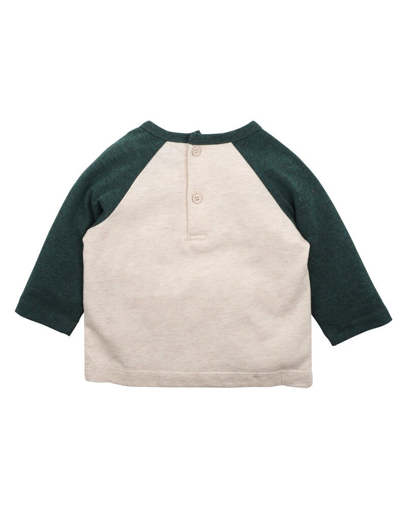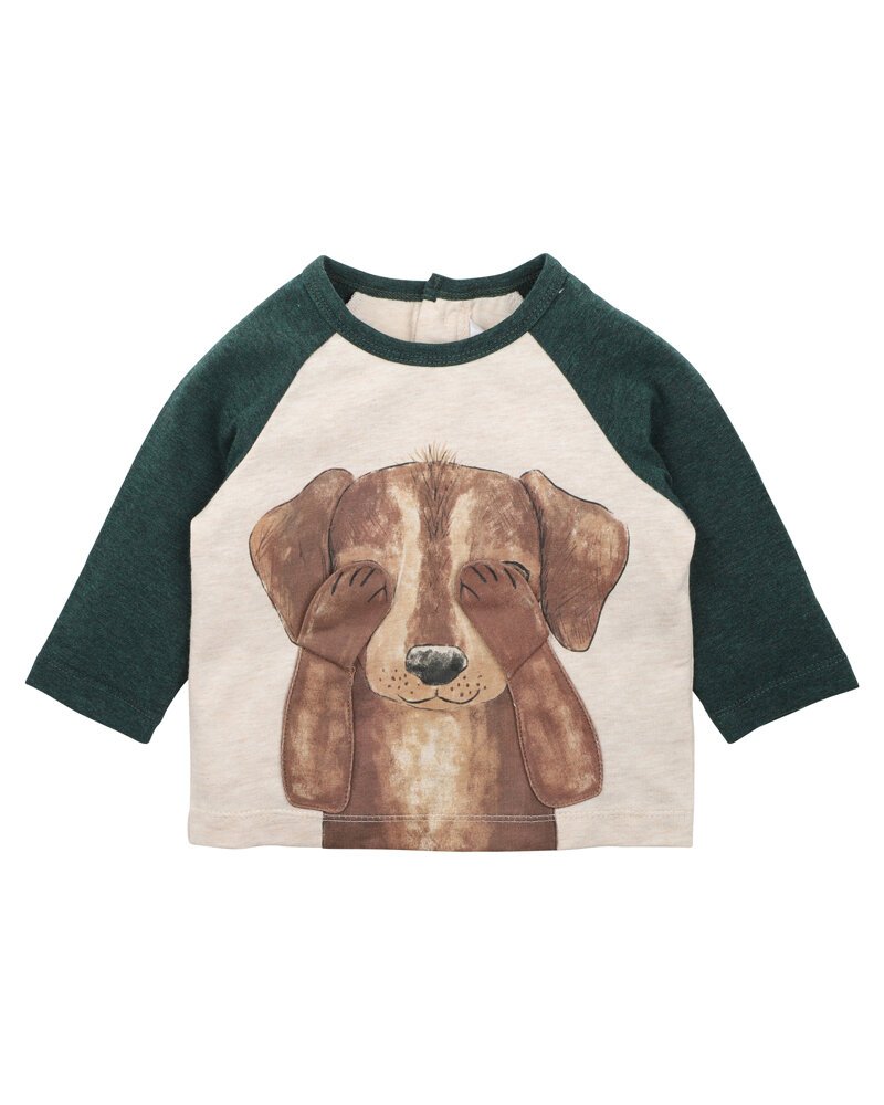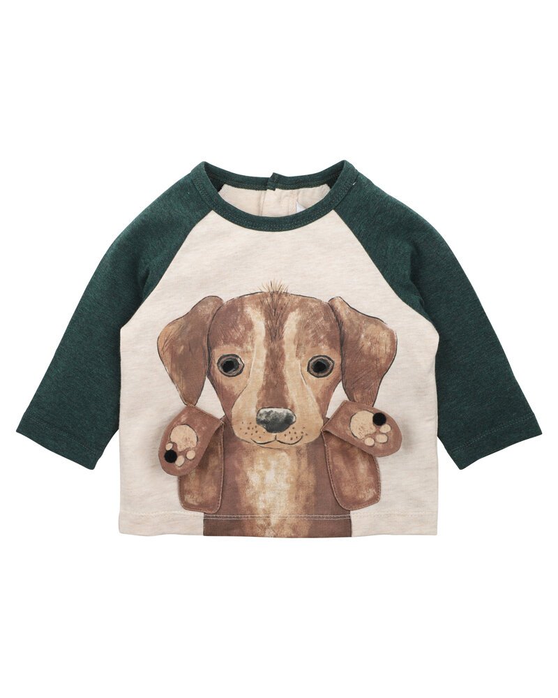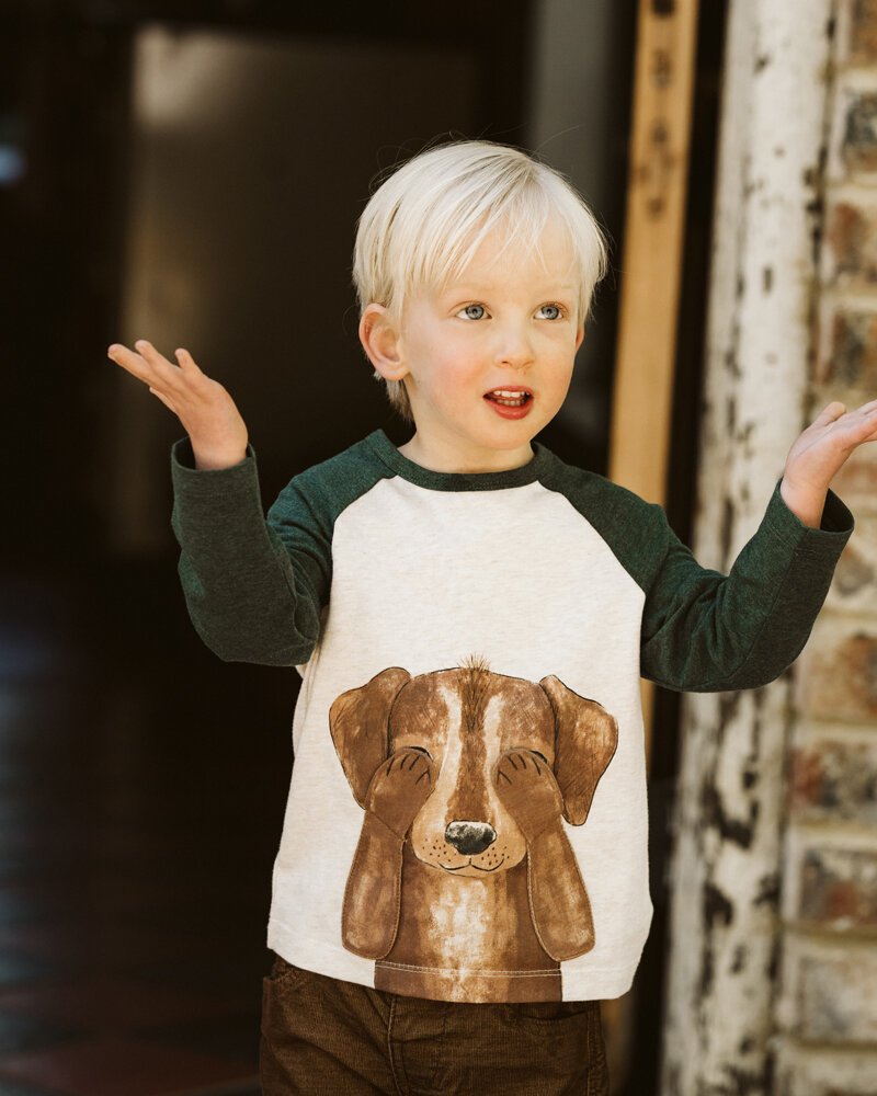This contrast raglan sleeve tee features a cute puppy dog playing peek-a-boo 3D graphic on the front making it a great basic for your little one's Winter wardrobe to wear back with the Austin cord pants for a complete outfit.