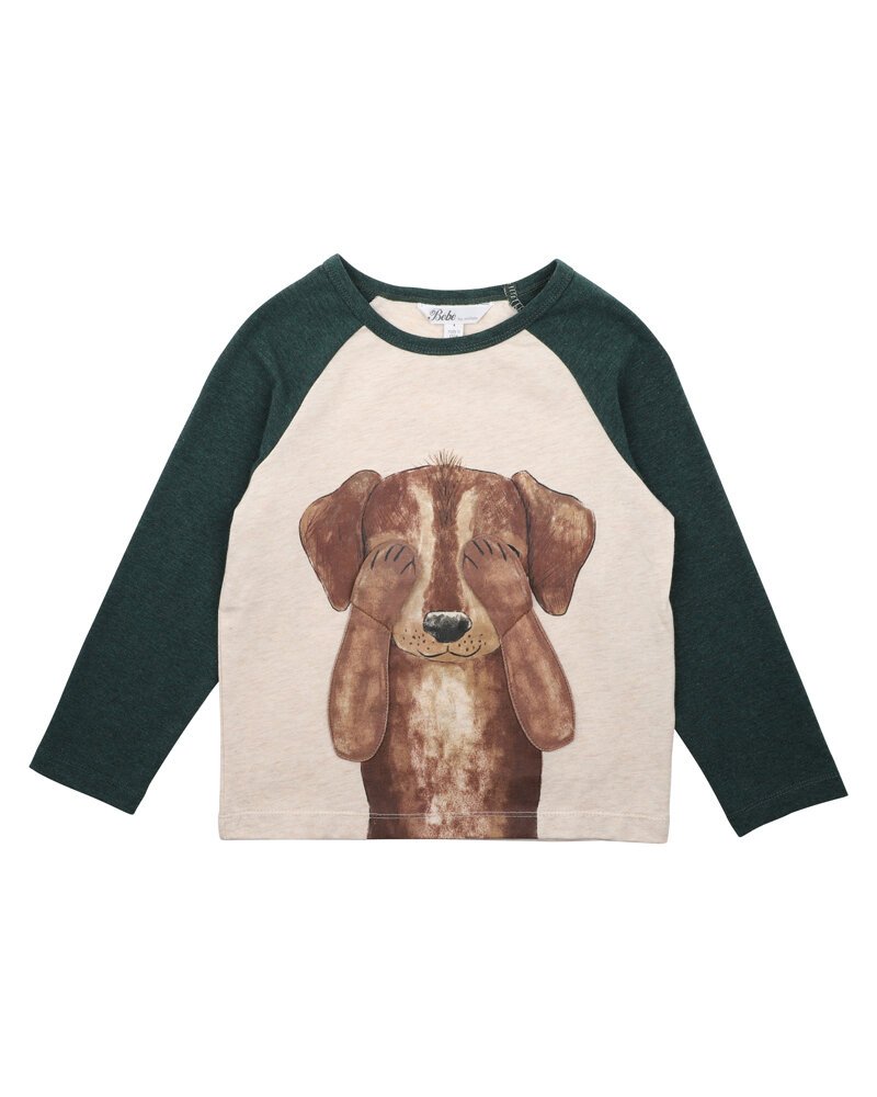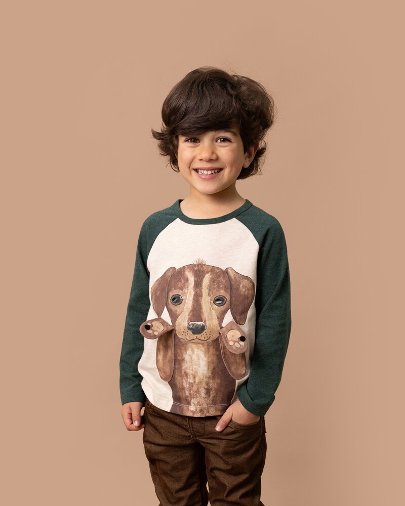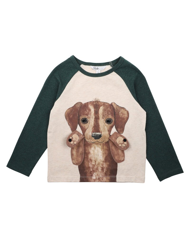 This contrast raglan sleeve tee features a cute puppy dog playing peek-a-boo 3D graphic on the front making it a great basic for your little one's Winter wardrobe to wear back with the Austin cord pants for a complete outfit.