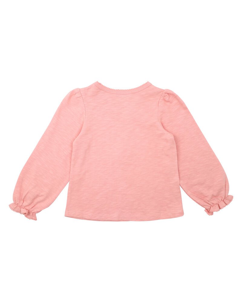 This gorgeous coral pink top is the perfect addition to your little ones winter wardrobe. Featuring a sweet embroidered ballerina image with an appliqued tule tutu, this top has elasticated cuffs with a back neck button opening for ease of dressing and a picot trim neckline and sleeve hem. Pair it with the Dotti print leggings for the perfect outfit.