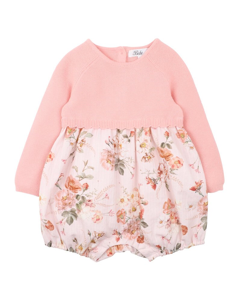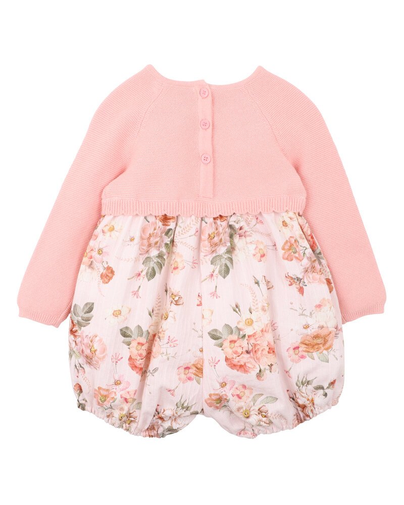 This adorable romper features a coral pink garter stitch knitted bodice with a scallop edge at the waist, back neck button opening and a gorgeous contrast floral woven bottom. A beautiful piece for your little one's winter wardrobe, pair it back with our knee high socks or pointelle tights.