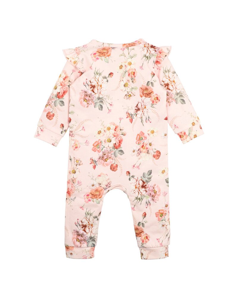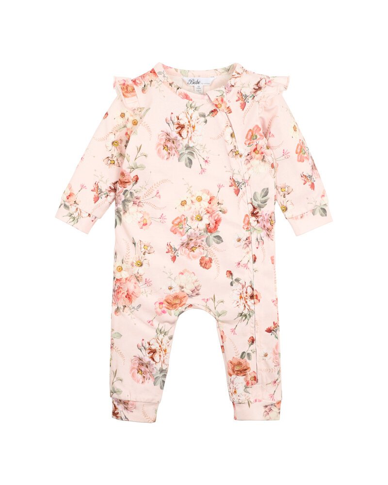 This sweet floral print features shoulder frills and a front zip opening to help you dress your little one with ease! A perfect mix of style and comfort, pair this onesie with the Dotti headband to complete the look.