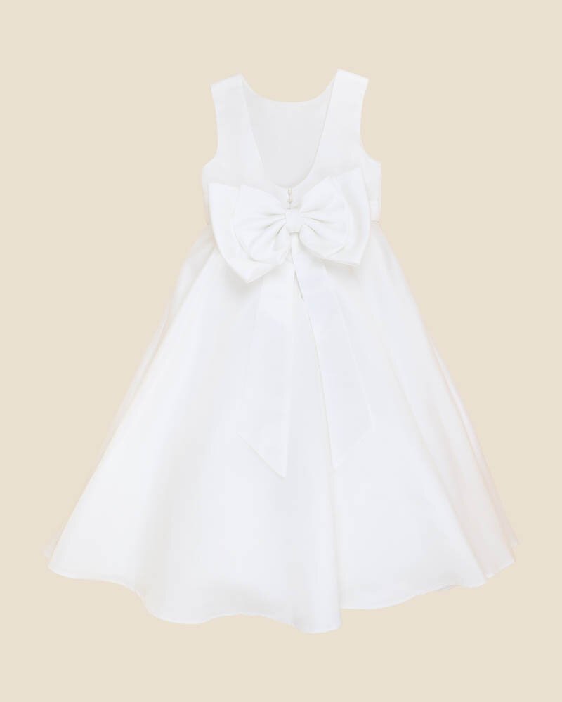 A timeless choice for special celebrations, this elegant full-length gown is crafted from luxurious duchess satin for a softly structured silhouette. The wide straps and deep scoop back are complemented by a statement double bow that sits proudly at the waist. Perfect for flower girls, first communions or any moment that calls for a little extra polish.