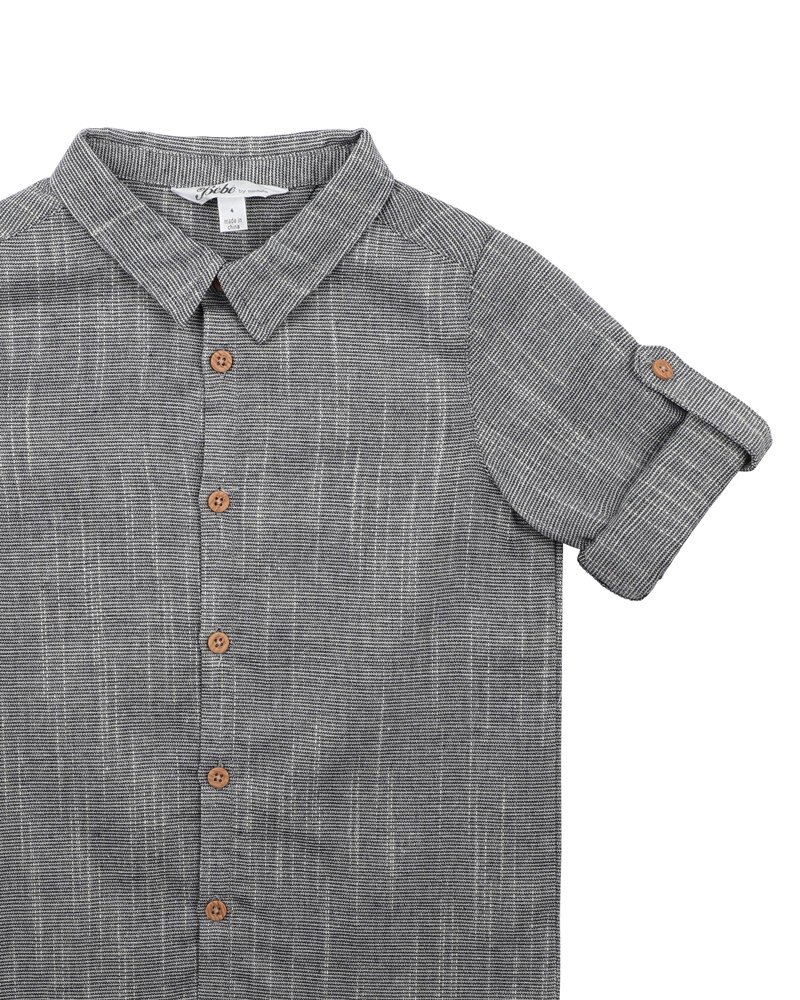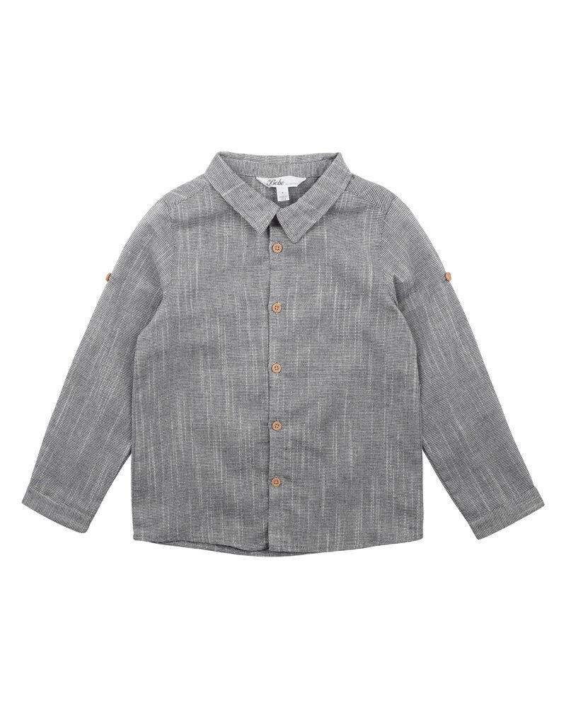 This navy stripe cotton shirt features a button up collar and adjustable long sleeves with buttoned sleeve tabs giving the option to make shirt short sleeved is and perfect for dressing up your little man.
