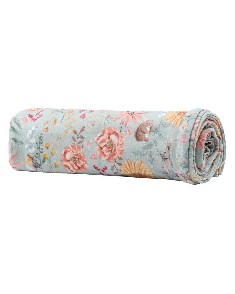 Featuring our gorgeous flora and fauna print with a contrast bound edge, this bunny rug is soft and stretchy and is the perfect way to keep baby warm and swaddled in the cot, pram or car.