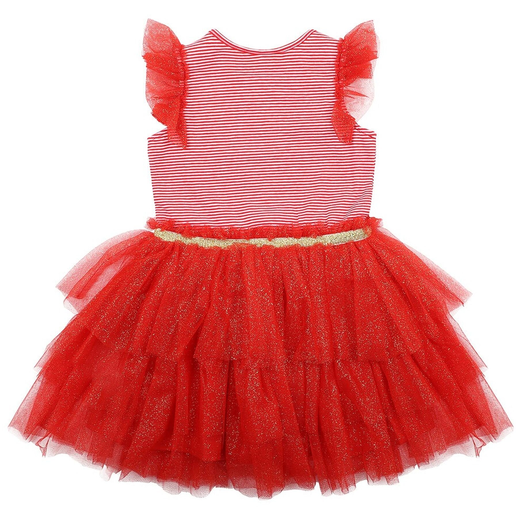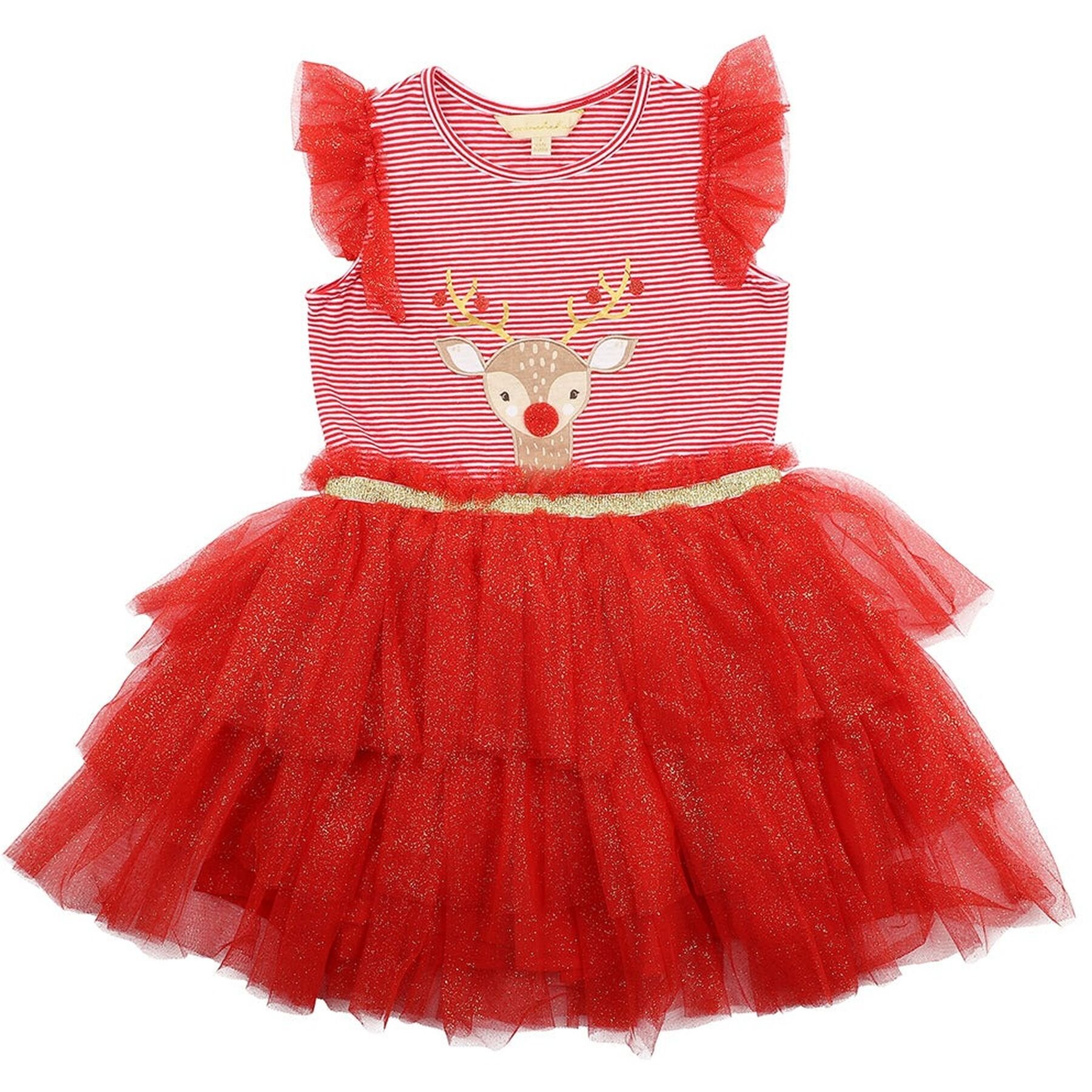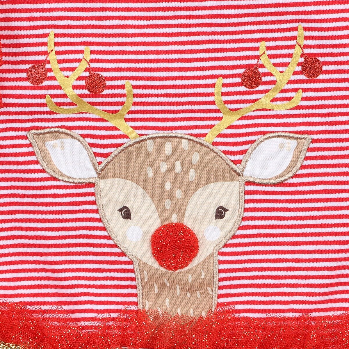 This lovely dress has everything for a spectacular Christmas. Comfort and style with the striped knit bodice and tulle frill sleeves featuring a cute appliqued reindeer graphic on front bodice and a tiered gathered glitter tulle skirt.