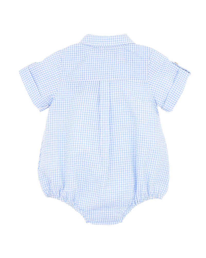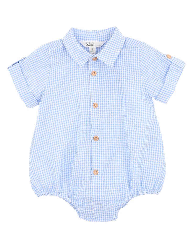 A timeless classic with a playful twist, this soft cotton check bodysuit is perfect for sunny days and special outings alike. The lightweight gingham fabric keeps little ones cool and comfy, while smart shirt styling-including a collar, front buttons and rolled sleeve tabs-adds a dressed-up touch. Elasticated leg openings and concealed crotch press studs make changes easy, without compromising on charm. Match back with the navy Roman pocket shorts for a coordinated look.