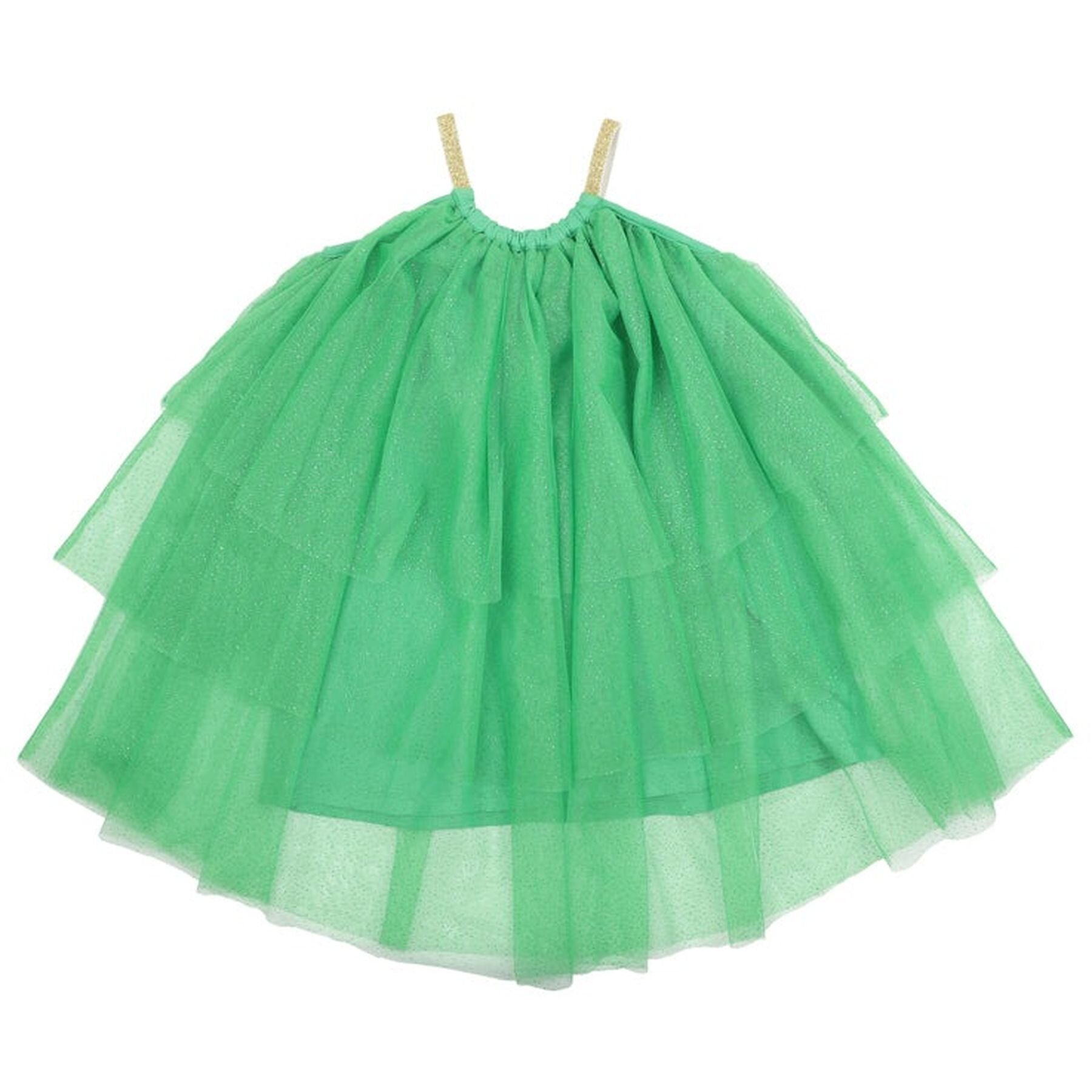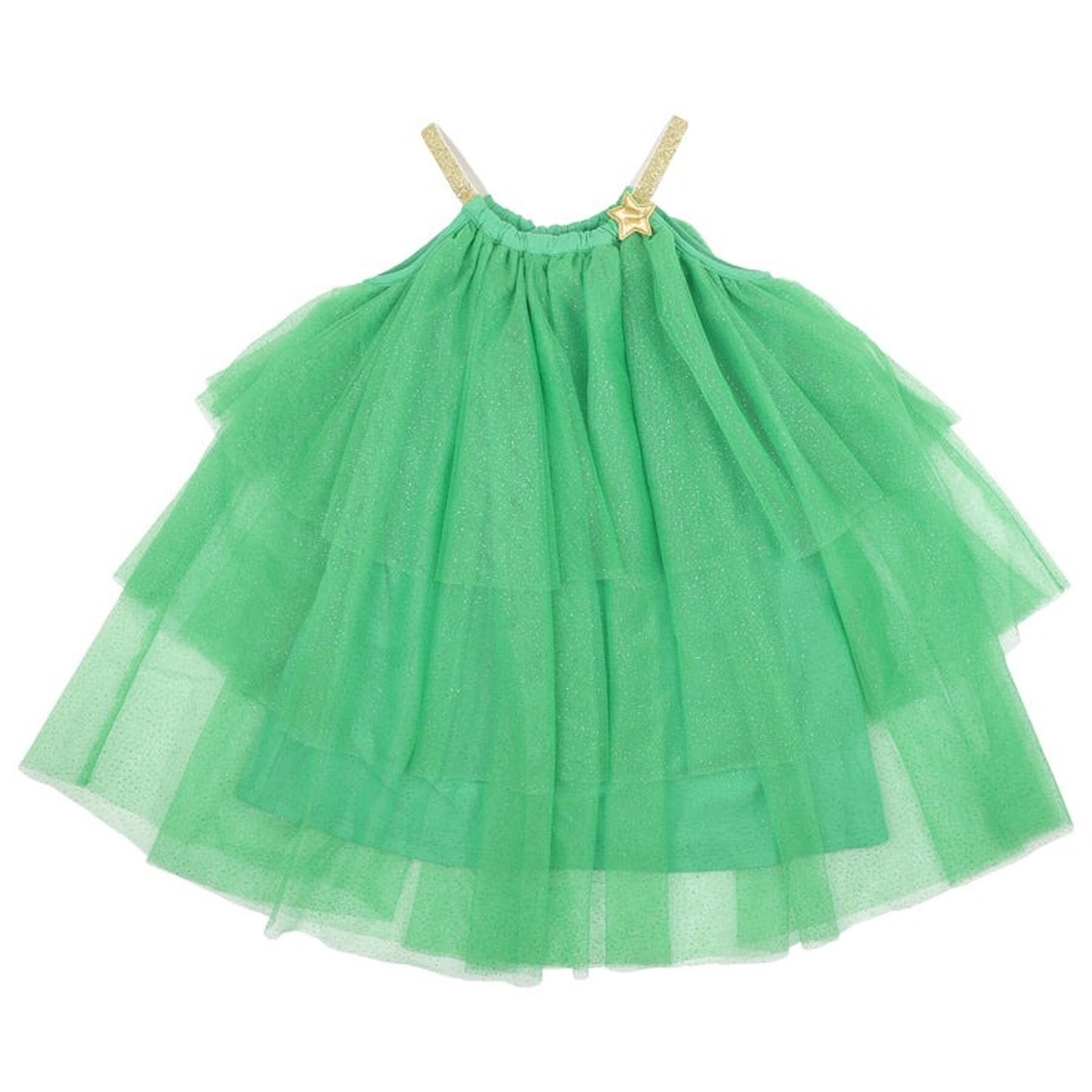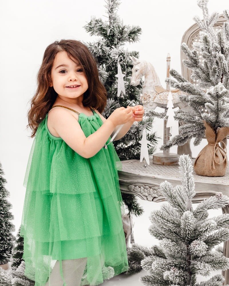 The Christmas spirit will never be far away with this gorgeous tiered green glittery tulle dress featuring a gathered neckline with gold elastic straps.
