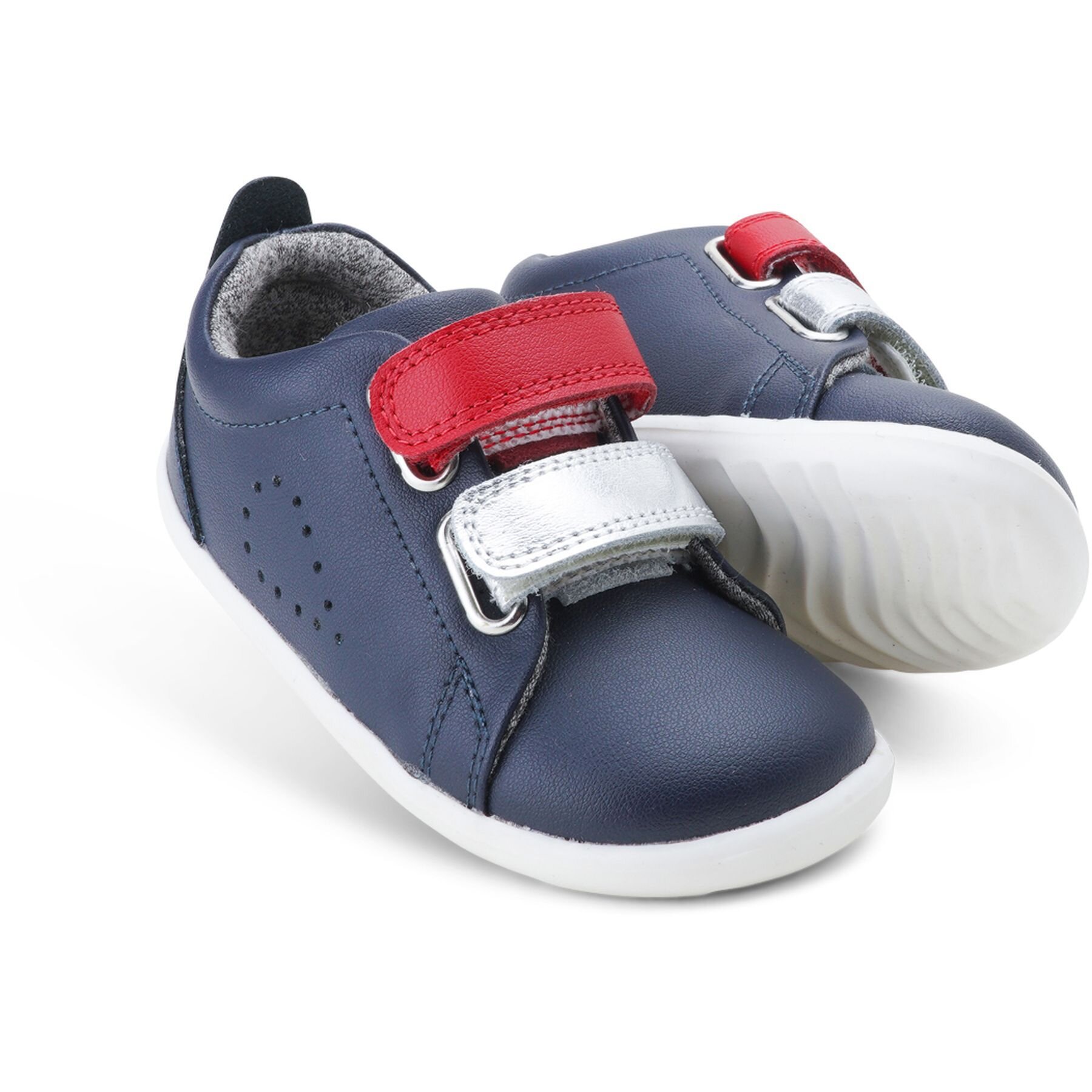 Let big personalities shine with our Grass Court Switch. Combining street-style and creativity, this premium leather trainer offers adjustability and ease of use with its new mix-and-match strap design. With a white sole, the Switch comes with a full set of matching navy straps, PLUS two extra straps per shoe in red and silver metallic for a versatile and playful look. The double strap closure provides an easy, secure fit while a cotton knit lining and padded collar keeps feet comfortable throughout the year. Suitable for first walkers, this style fits true to size.