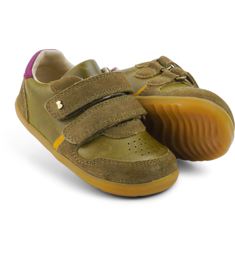 The Riley is a retro-inspired trainer, perfect for special occasions and everyday style. Embossed detailing and a two tone olive and boysenberry colourway with racing stripe complete a preppy look, while the natural and breathable materials are designed to keep kids’ feet cosy. This understated style offers adjustability and a secure fit with double hook-and-loop strap fastening, with a padded heel collar for added comfort. Suitable for first walkers, this style fits true to size.