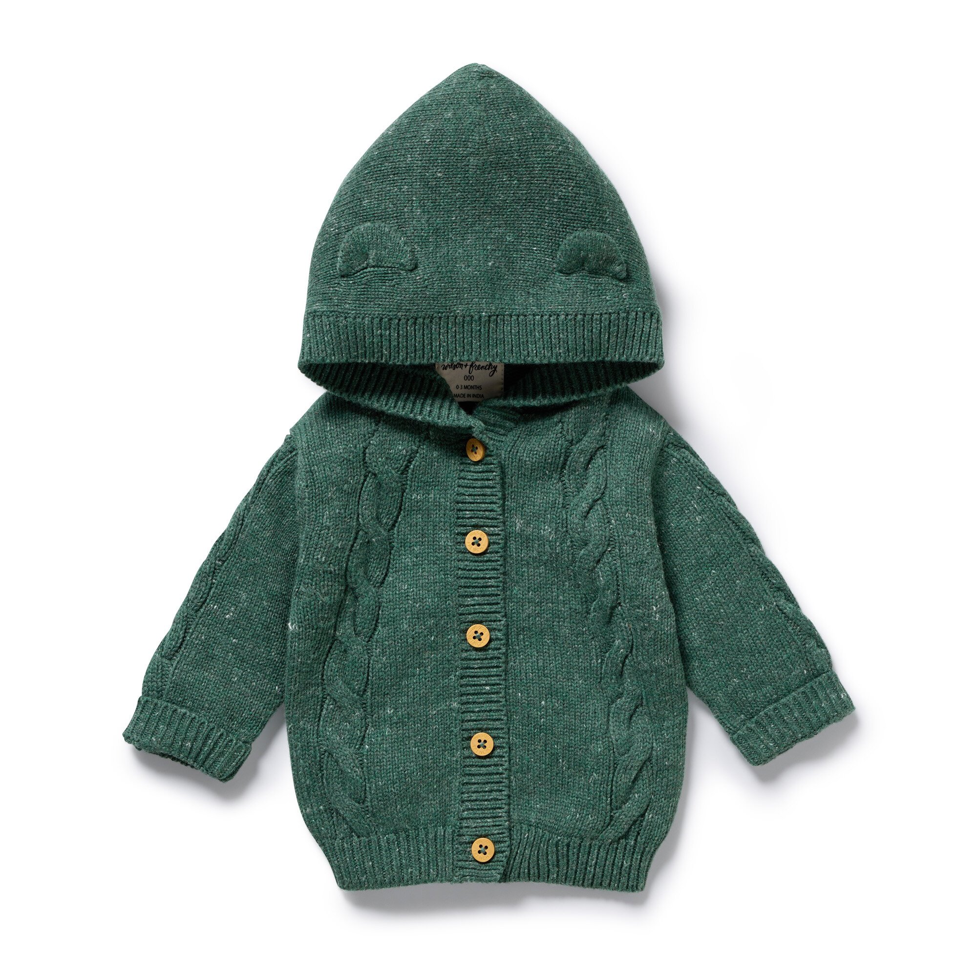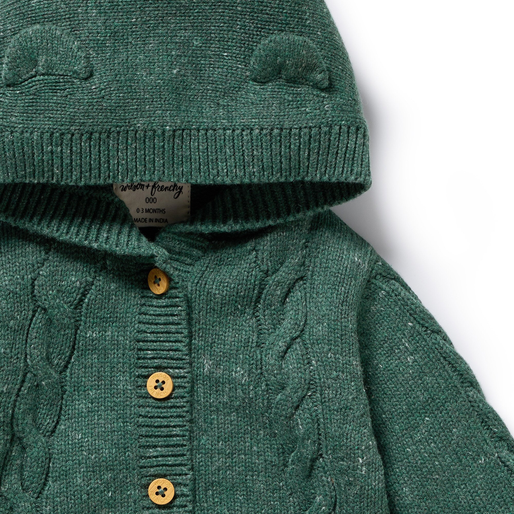 Key Features: Bear ears detail. Front button opening. Mock wood buttons. Cotton, bamboo, wool blend.