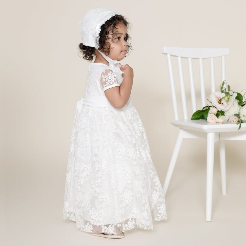 The Sophia Christening Bonnet features exquisite embroidered lace tulle over soft cotton fabric with a satin bow tie. Lovely when paired with the Sophia Christening Gown and Bib.