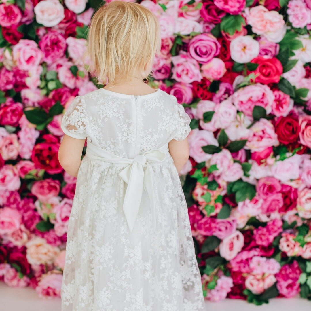 The Sophia Christening Gown features exquisite embroidered lace tulle, complimented by a chiffon tie at the waist (can be tied either at front or back), cap sleeve, back zip and soft cotton lining. Lovely paired with the Sophia Christening Bonnet and Bib.