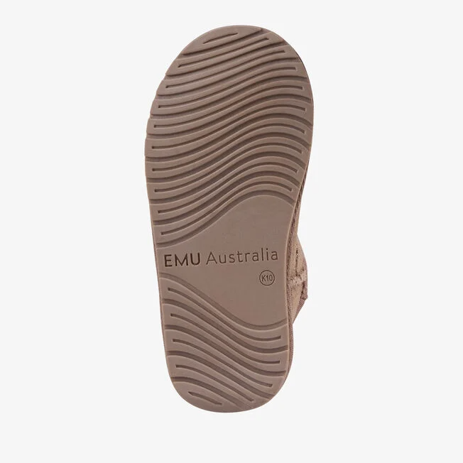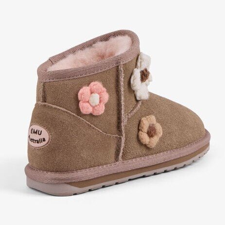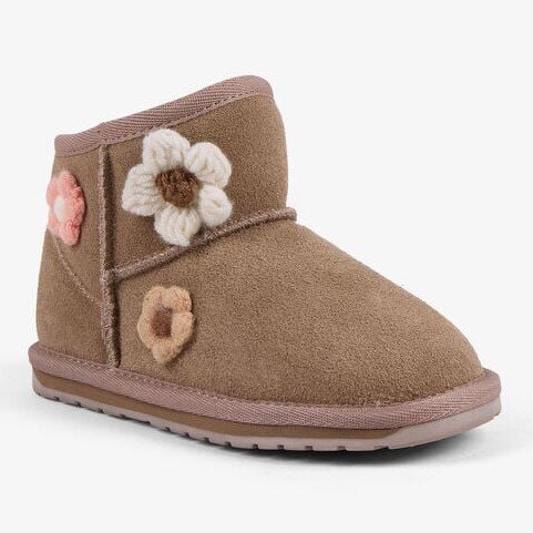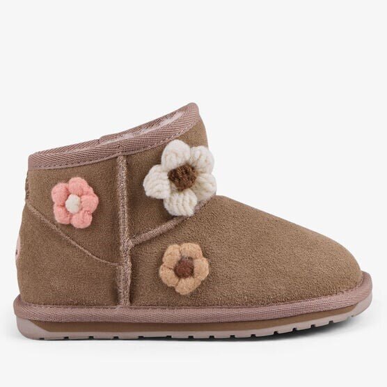 A little bit whimsical, a whole lot of warm. This sweet mini boot is made with a soft suede upper, flexible outsole and Australian Merino wool lining to keep tiny feet comfy all day long. The oblique-cut top adds a unique touch, but it’s the blooming daisies that really steal the show. They pop right off the boot for a playful finish that’s anything but ordinary. Cute, comfy and made to move with them.