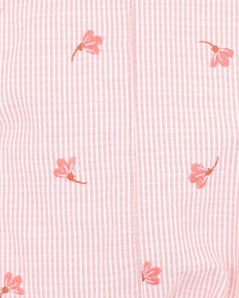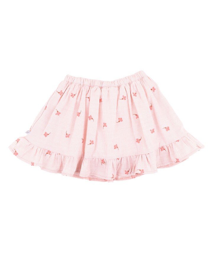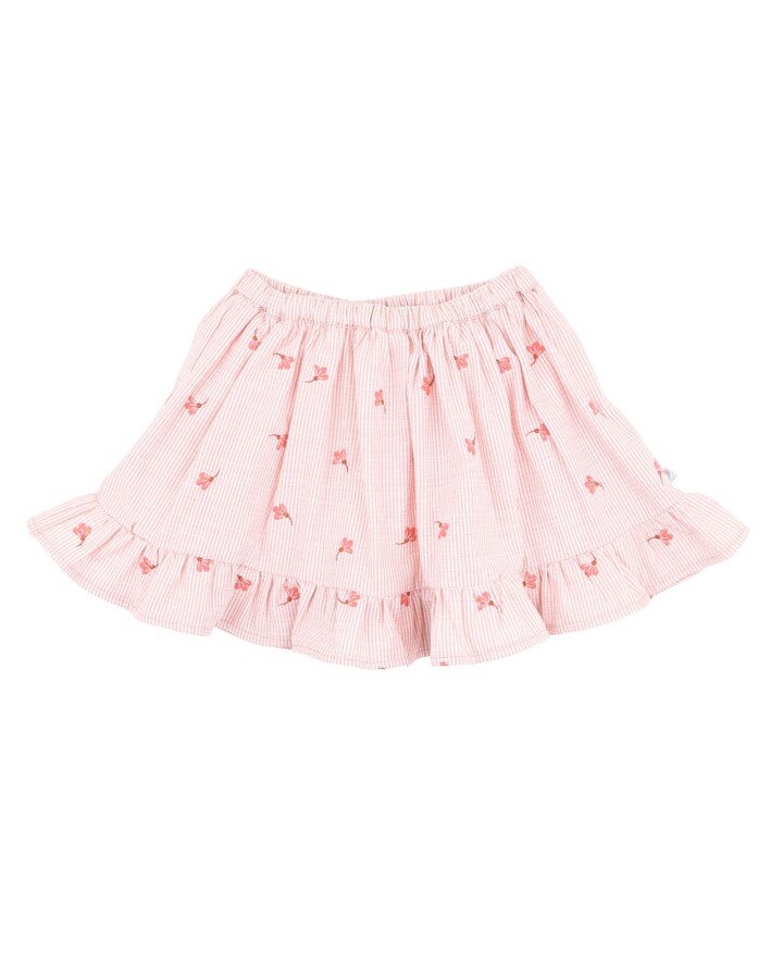 Perfect for twirling, skipping, and sunny-day play, this embroidered frill skirt brings a touch of vintage charm to everyday adventures. With its soft pink stripe, delicate floral embroidery, and built-in shorts, it's made for comfort and whimsy in equal measure. pair it back with the Songbird Embroidered tee for a complete outfit.