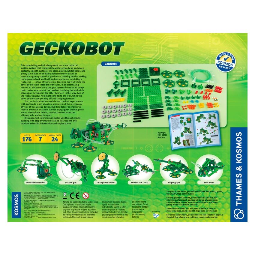 You can build six other models and conduct experiments with suction to learn about air pressure and the mechanical physics of this unique device. Build models of an industrial robotic arm with a vacuum suction cup gripper, crawling inch worm, smartphone holder, suction tow truck and car, ellipsograph, and suction gun.