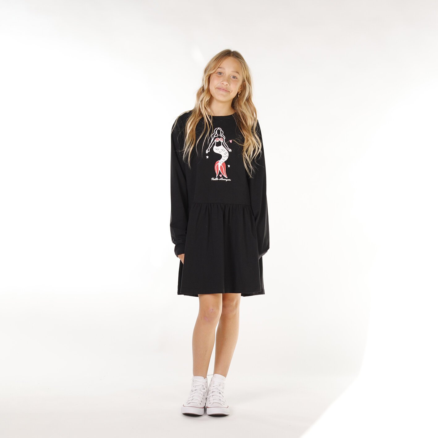 Say hello to the perfect everyday dress. The Monday Dress features a fun chest print, long sleeves, and a flowy A-line skirt for all-day comfort and style. Made from soft cotton with a bit of stretch, it's ideal for cooler Autumn days — just add leggings and socks for extra warmth when winter rolls in.• 95% cotton / 5% spandex single jersey knit• Soft, breathable, and comfy with stretch• Chest print detail• Darted A-line skirt for twirl-worthy shape• True to size fit• Designed in New ZealandEstablished in 2014 and based in the beautiful beachside town of Mount Maunganui, Hello Stranger Kidswear is a fun lifestyle brand created for adventure loving kids who just want to look rad & be comfortable whilst being totally awesome! Founder Amy wanted to bring to life her beach meets street style for kids and develop an edgy collection with fresh ideas introduced every season to inspire young minds and let kids just adventure and be free. Designed for kids aged 1-12 years, Hello Stranger Kidswear over the years has been featured at New Zealand Fashion Week & in national magazines with their beach street style.