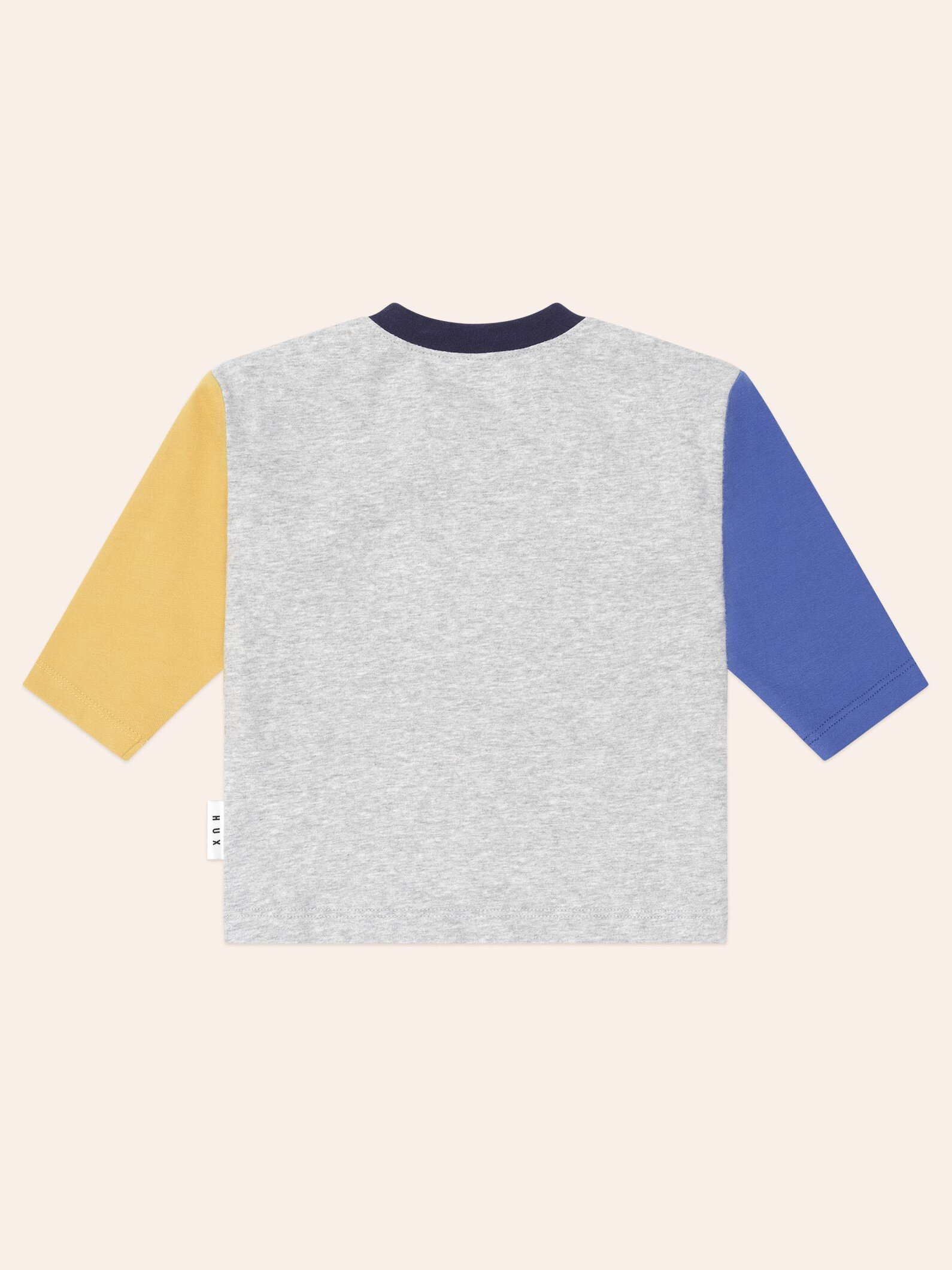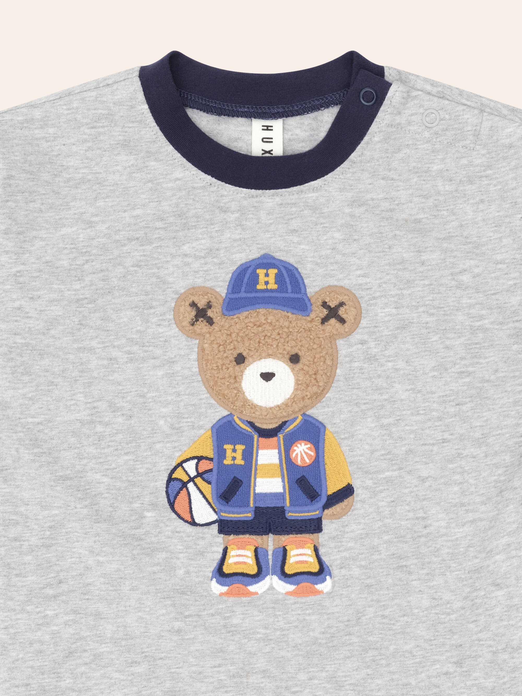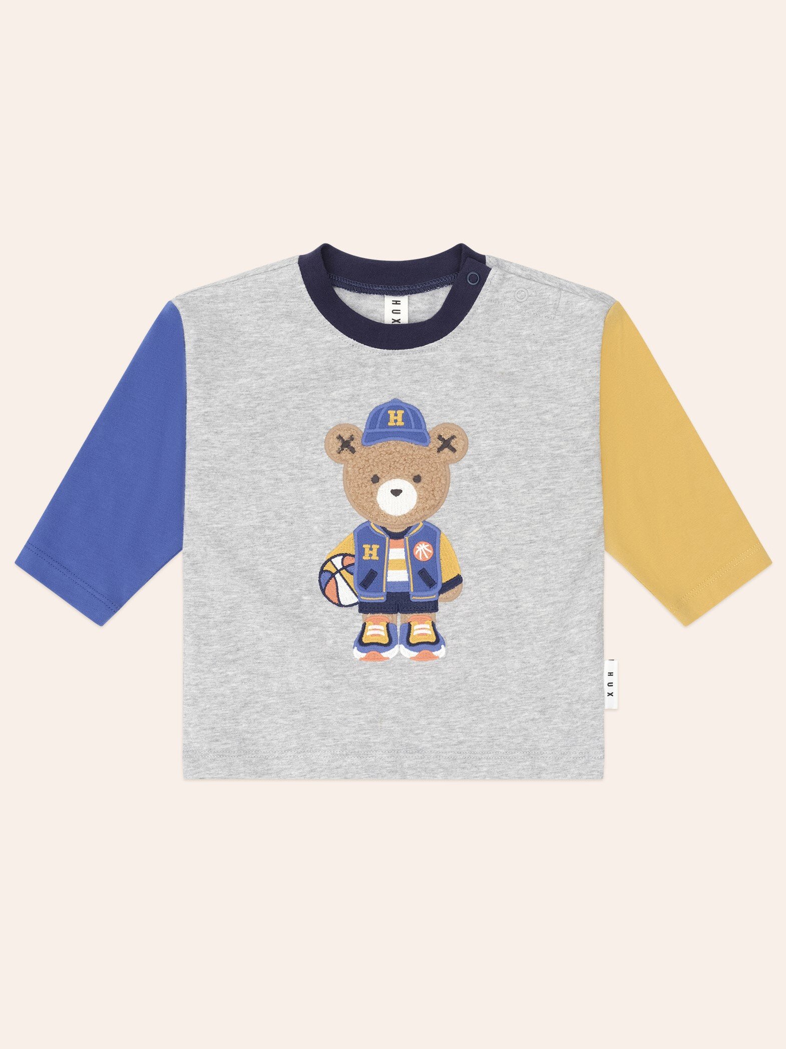 A long-sleeved round neck top in classic colour blocking. Made from cloud-like organic cotton, it features tummy-sized baller Huxbear embroidery in the softest furry fabric. Baby sizes include stainless steel shoulder snaps for even easier dressing. 95% certified organic cotton, 5% elastane Grey Marle Designed in Melbourne