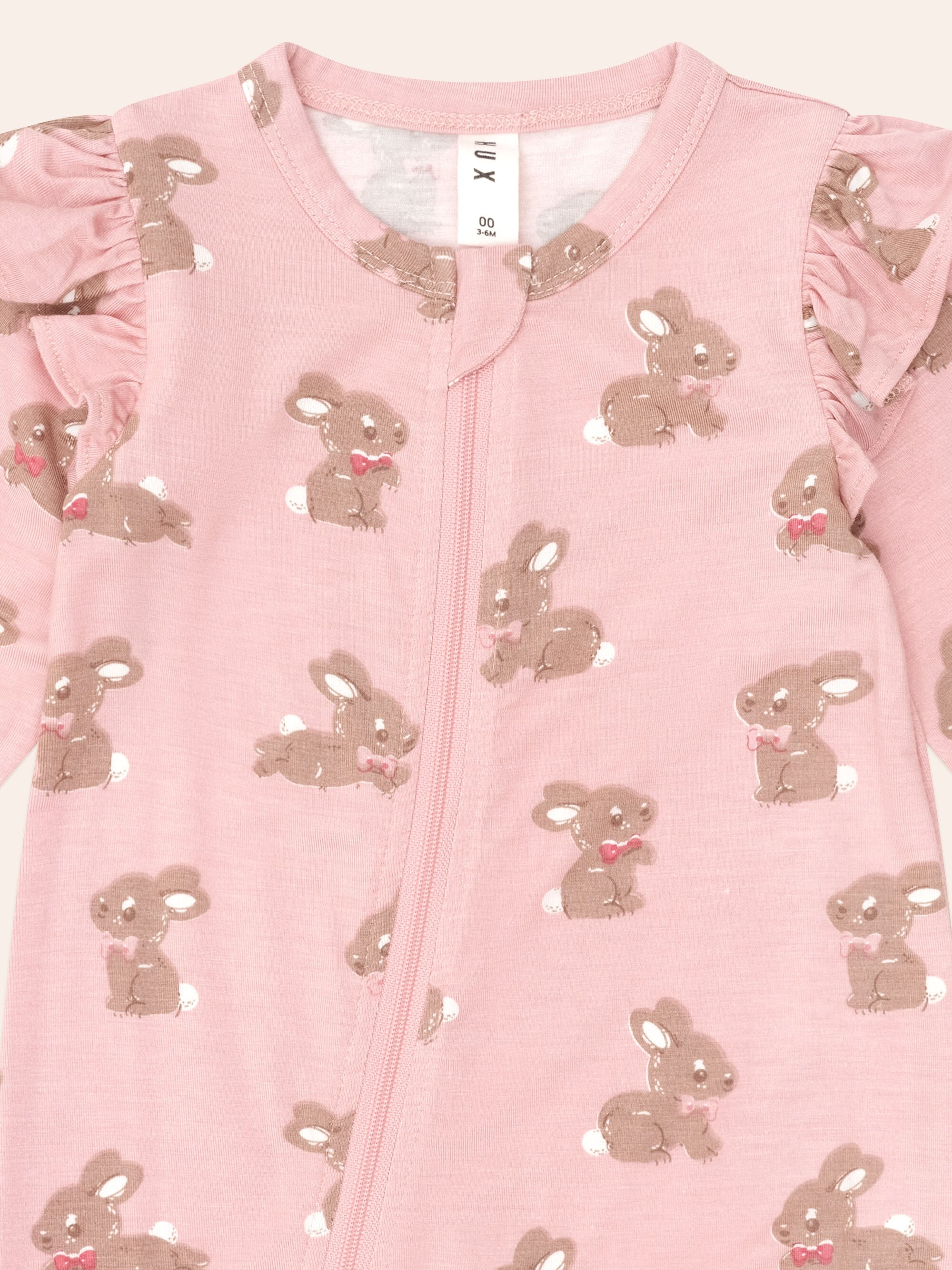 This buttery soft romper is made from the most delicious bamboo blend that baby will love. It has sweet shoulder frills and a cute bunny print. It features a full length, two-way zipper for easy nappy changes and a safety fold zip for peace of mind. Just add squishy legs. 95% bamboo viscose, 5% elastane Dusty pink Designed in Melbourne