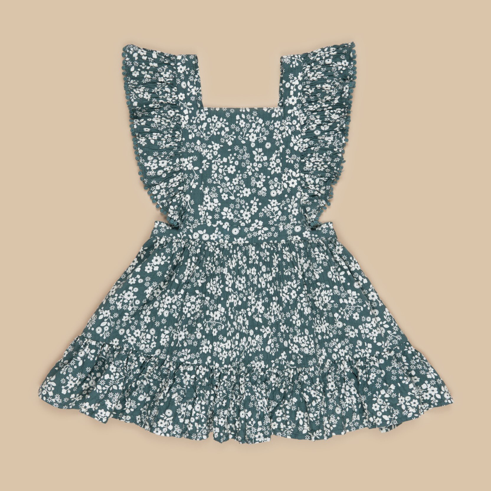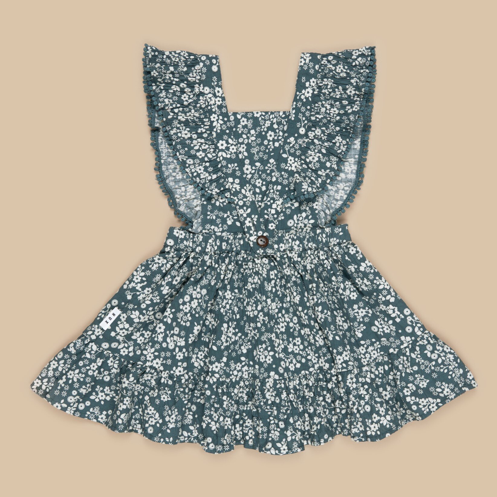 Super cute crinkle cotton voile ruffle bib pinafore dress with all over floral pine print