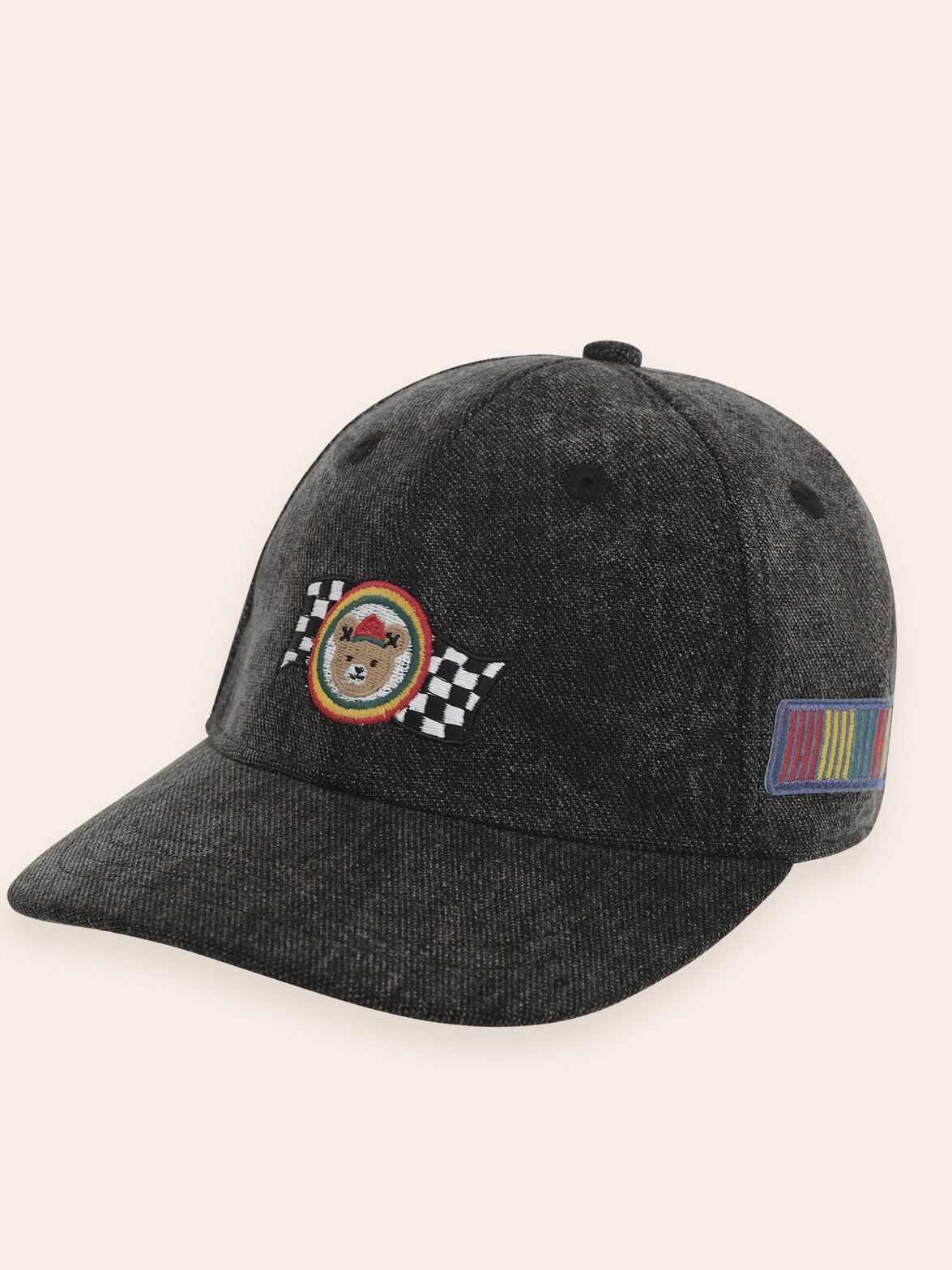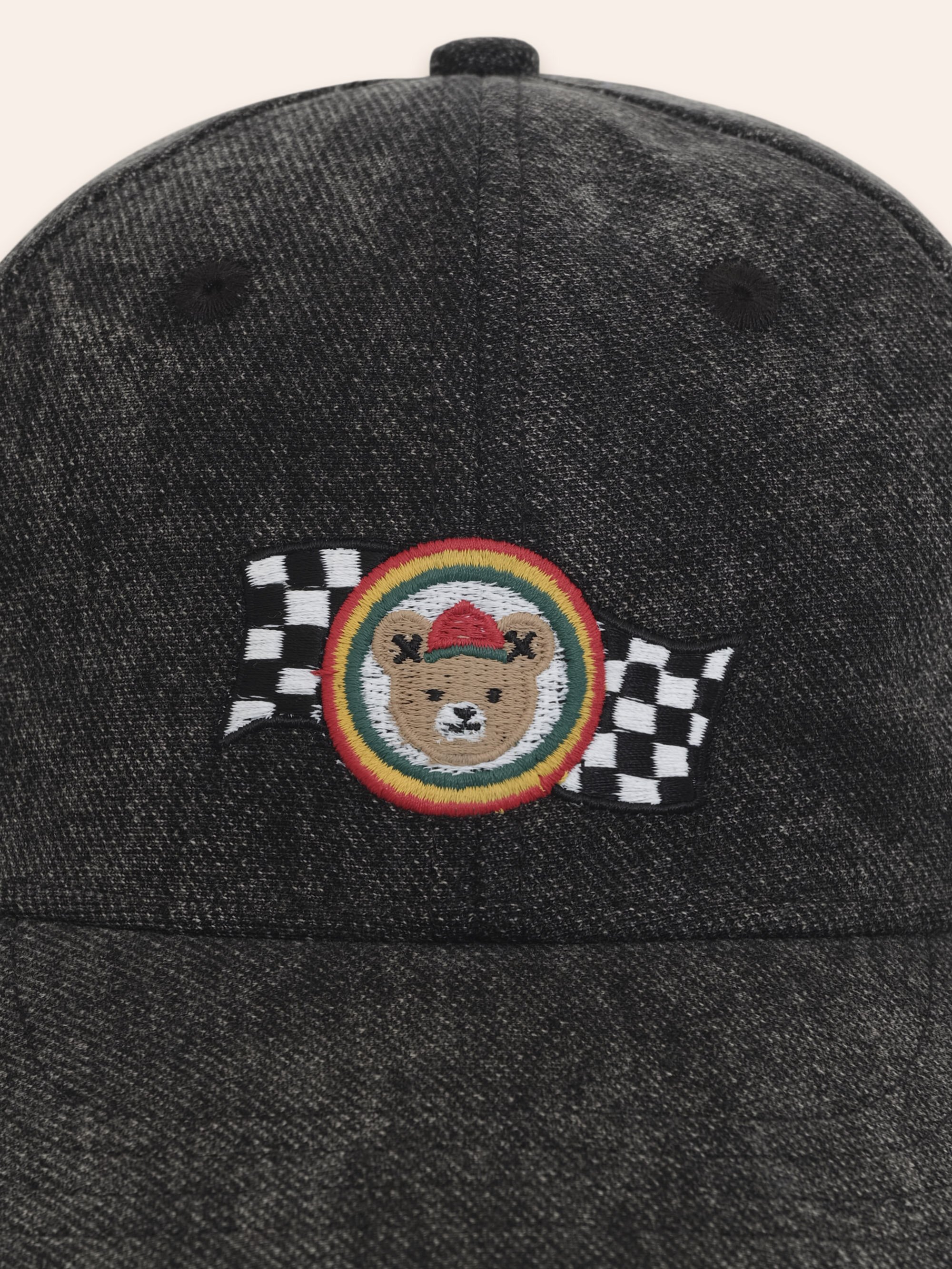 THE cap for cool kids. Made in a classic black denim with an embroidered Huxbear racing patches and an adjustable velcro back strap for comfy fits. 96% cotton, 4% elastane Denim black One size fits all - up to 54cm Designed in Melbourne