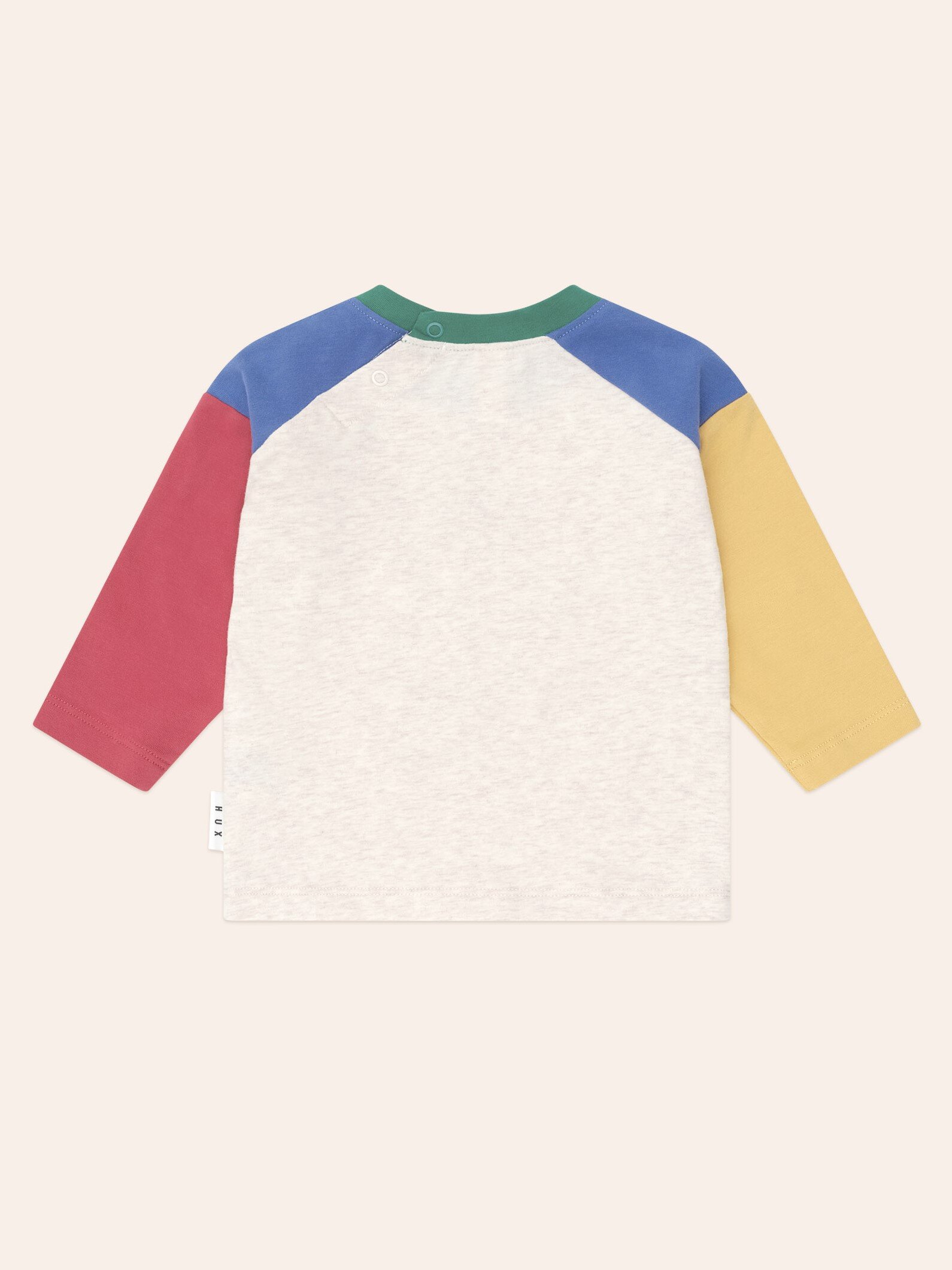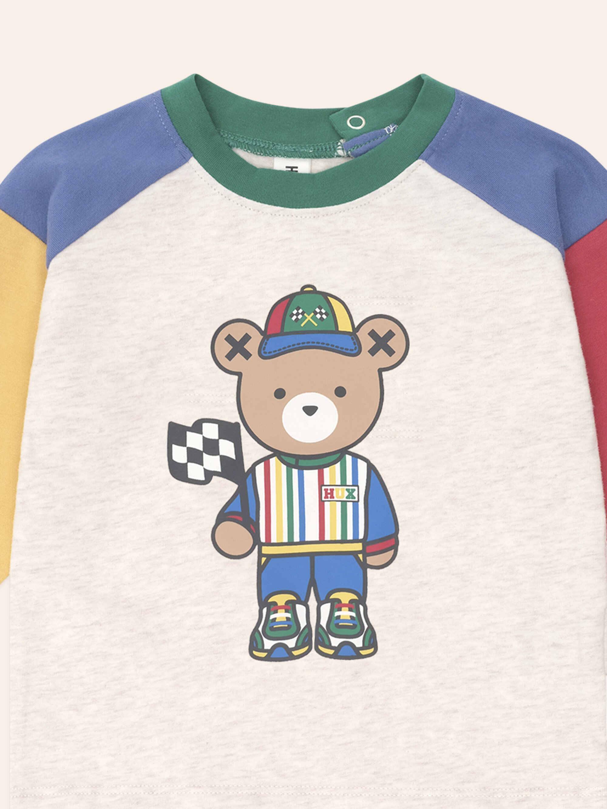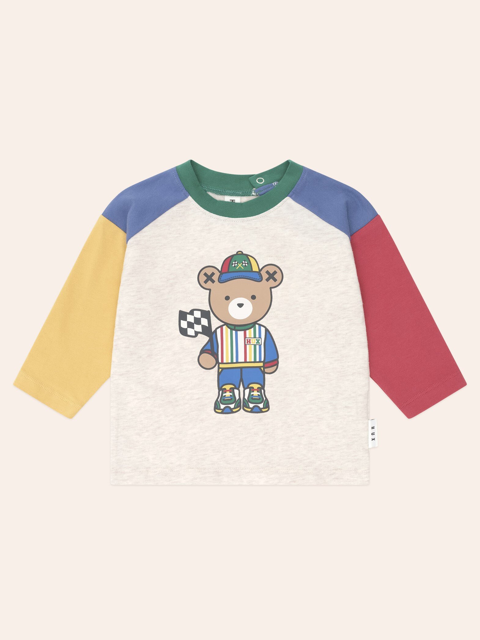 A long-sleeved round neck top in off white Marle colour blocking. Made from cloud-like organic cotton, it features tummy-sized motorsport Huxbear embroidery in the softest furry fabric. Baby sizes include stainless steel shoulder snaps for even easier dressing. 95% certified organic cotton, 5% elastane Off white Marle Designed in Melbourne