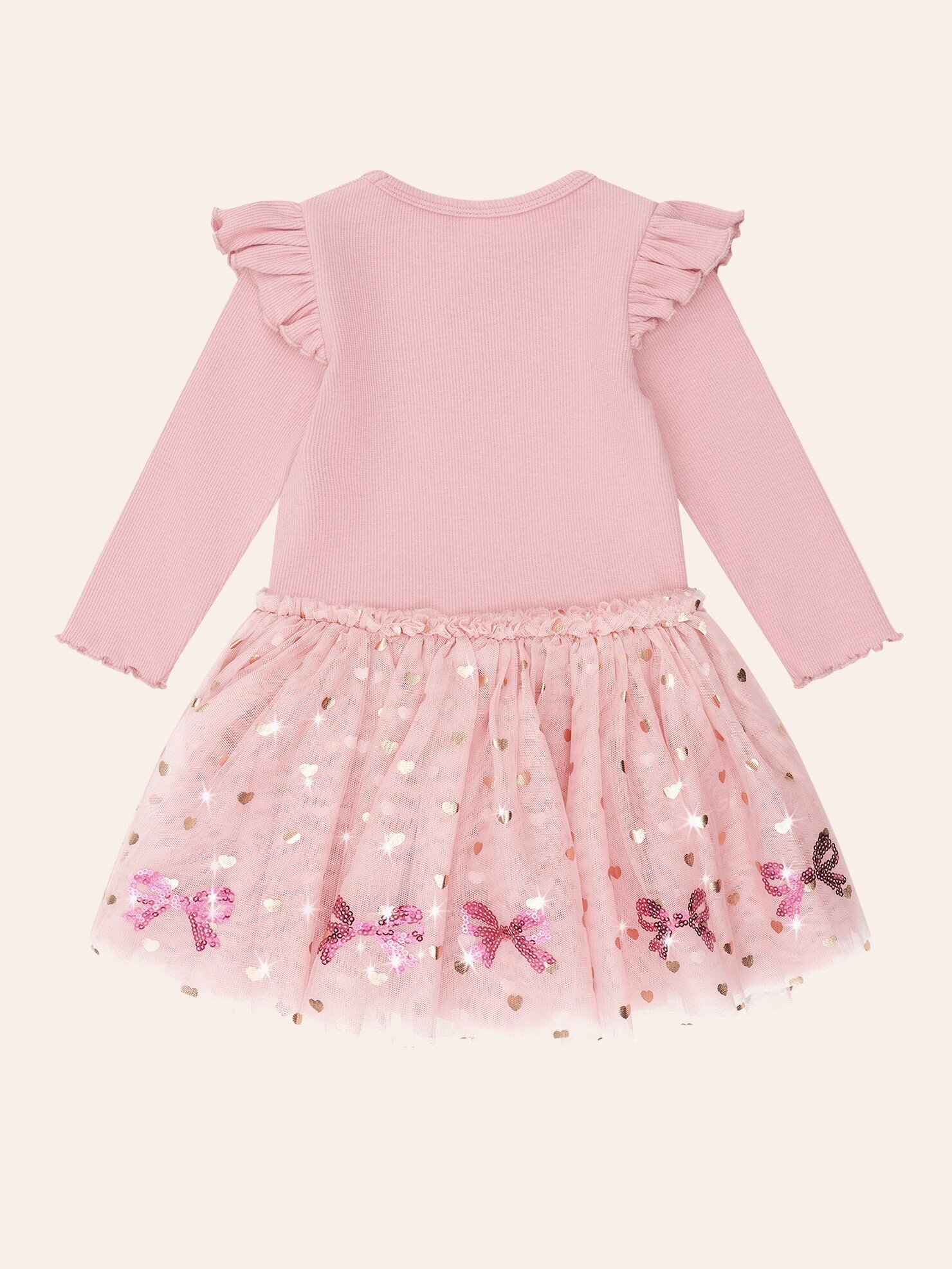 Other party dresses can?t compare. Your little girl will twirl to her heart?s content in this full bodied ballet dress. This long sleeve dress features sweet shoulder frills, a tulle skirt, custom sequin bow embroidery and lettuce edge sleeves. 100% polyester tulle, 95% cotton body and 5% elastane rib Dusty pink Designed in Melbourne