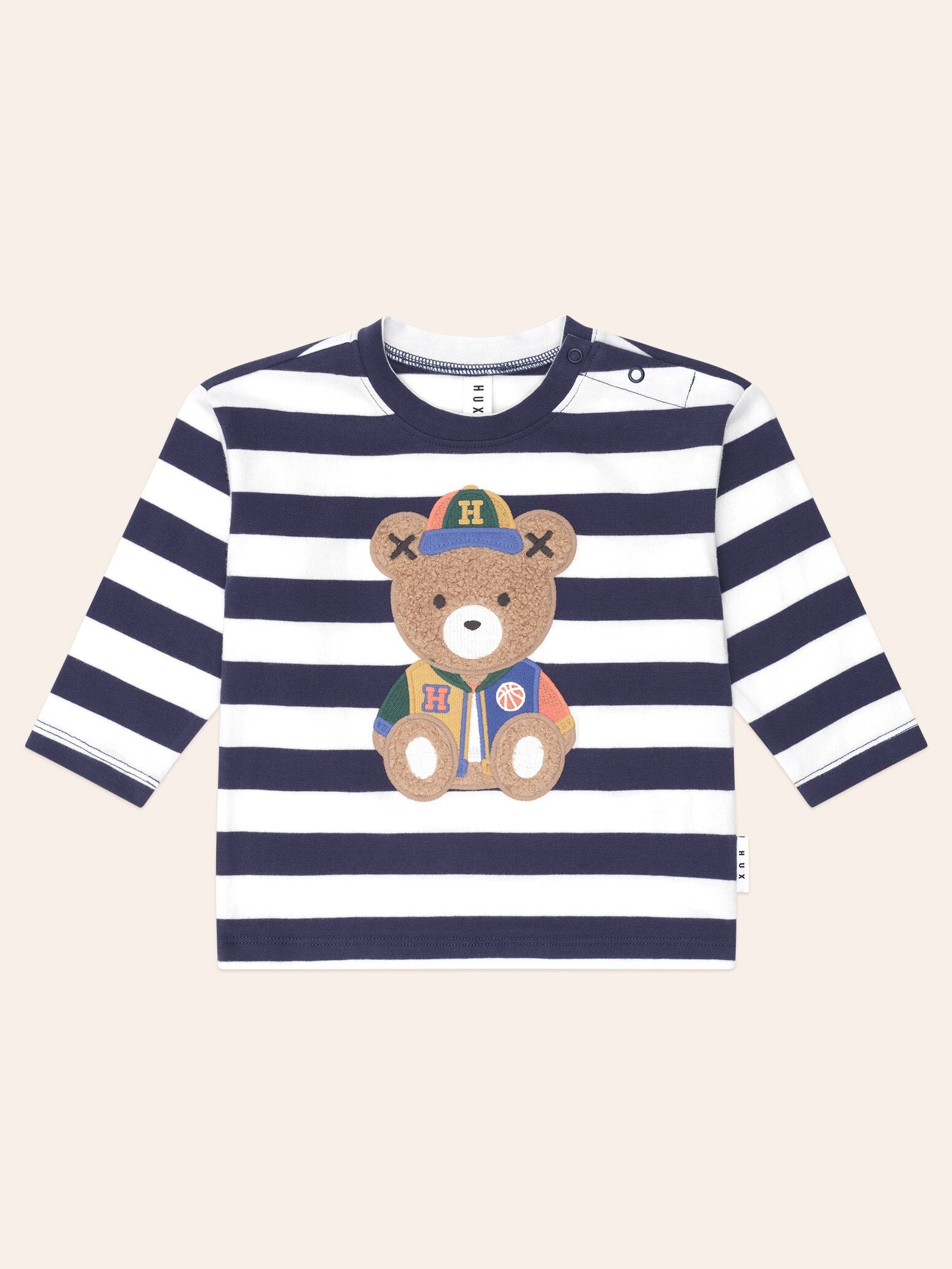 A long-sleeved round neck top in navy and almond milk stripes. Made from cloud-like organic cotton, it features a tummy-sized Huxbear embroidery in the softest furry fabric. Baby sizes include stainless steel shoulder snaps for even easier dressing. 95% certified organic cotton, 5% elastane Navy and almond milk Designed in Melbourne