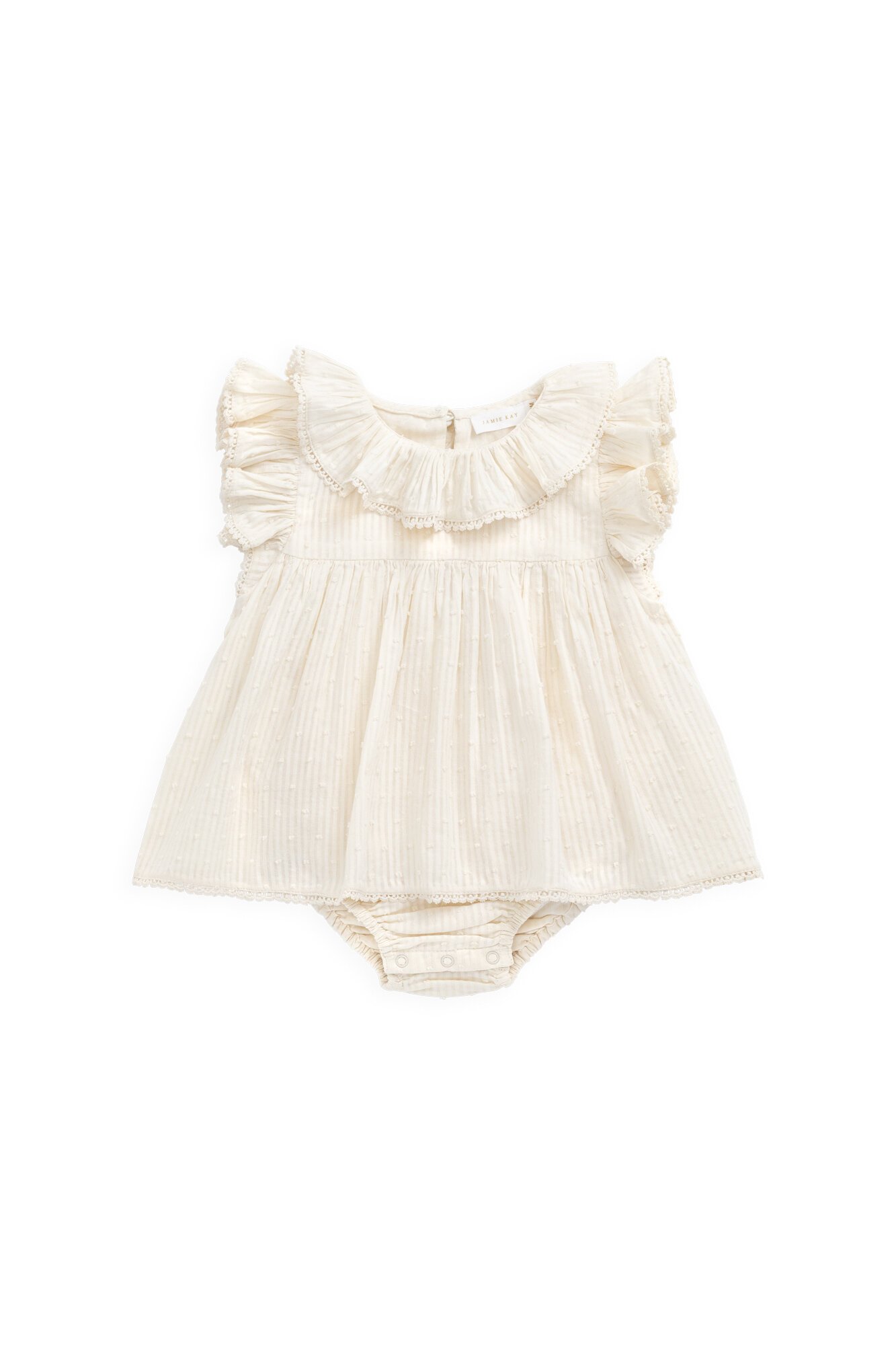 The Frannie Playsuit in Parchment is a dreamy, vintage-inspired piece designed for elegance and comfort. Featuring a soft neutral tone, delicate muslin texture, and charming ruffle details on the collar and flutter sleeves, this playsuit is perfect for warm days or layering with Jamie Kay knitwear on cooler ones.