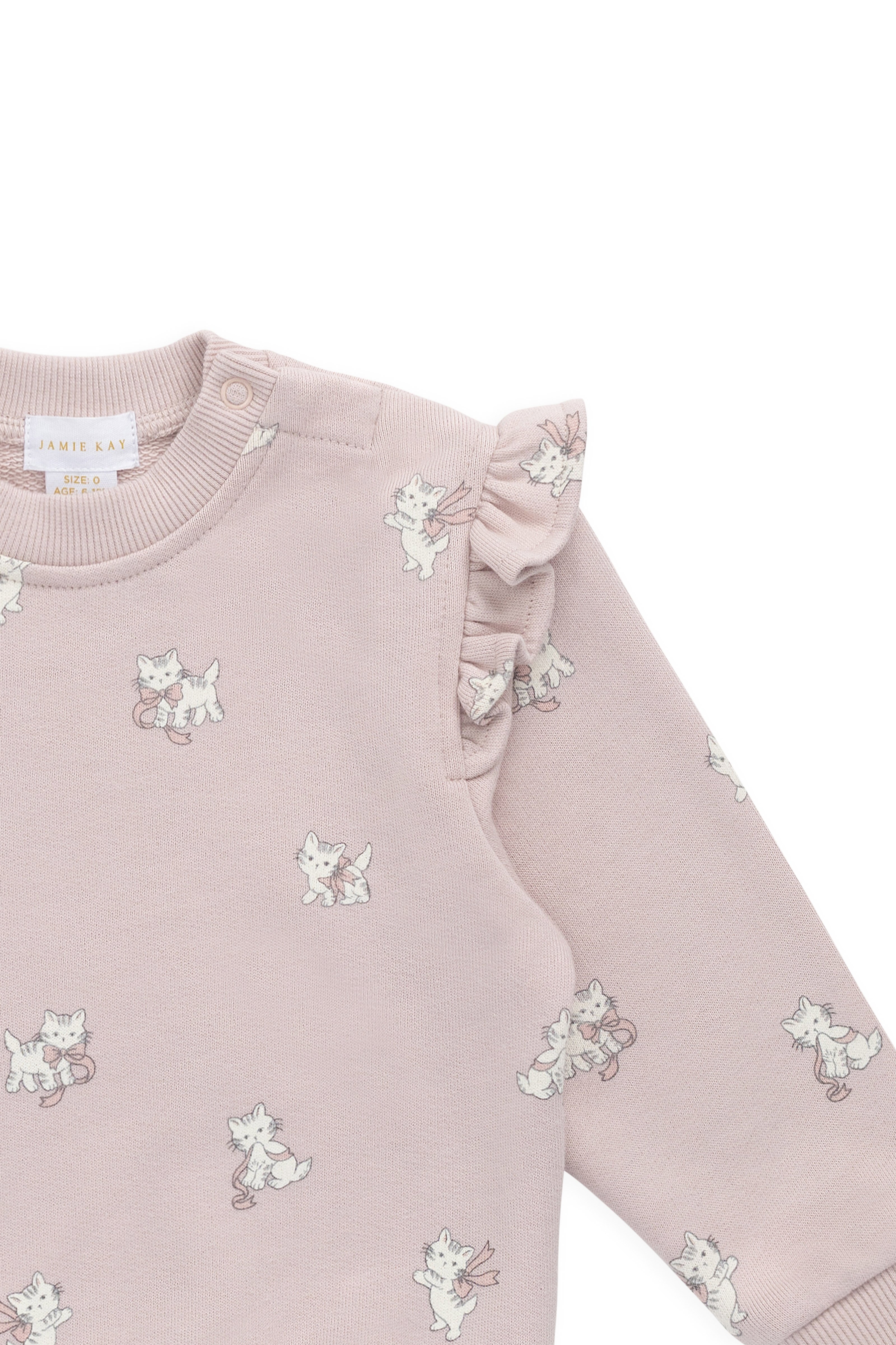 The Maple Sweatshirt in Bow Kitties Mauve is a sweet and cozy piece designed for everyday comfort with a touch of charm. Featuring delicate ruffle details on the shoulders and an adorable bow kitty print, this sweatshirt is perfect for layering during cooler days while keeping your little one stylish and snug.