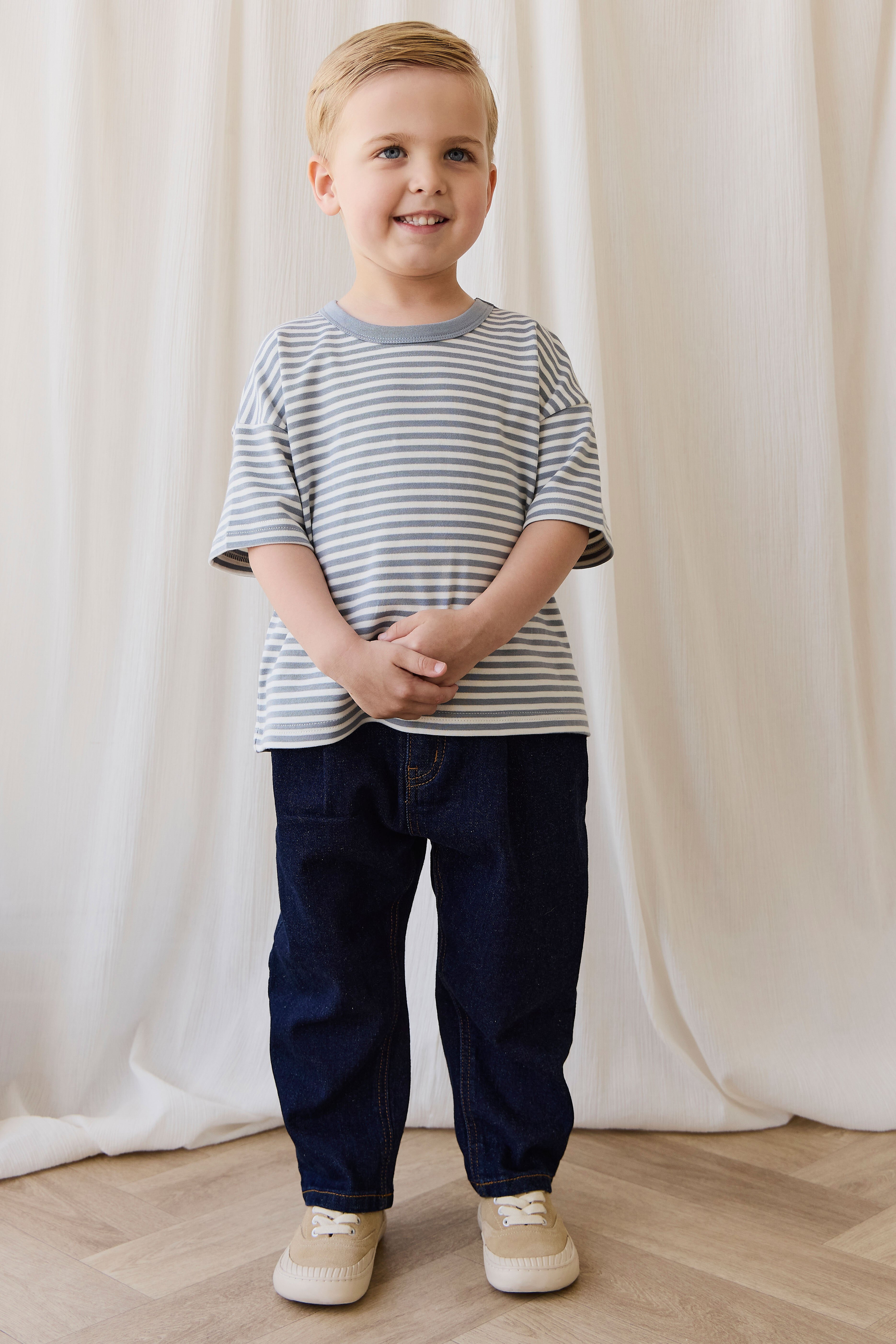 The Rueben Pant in Mid Indigo Denim is a stylish and practical piece designed for everyday wear. Featuring a relaxed fit with a tapered leg and elastic waistband, these pants offer comfort and flexibility while keeping your little one looking effortlessly chic.