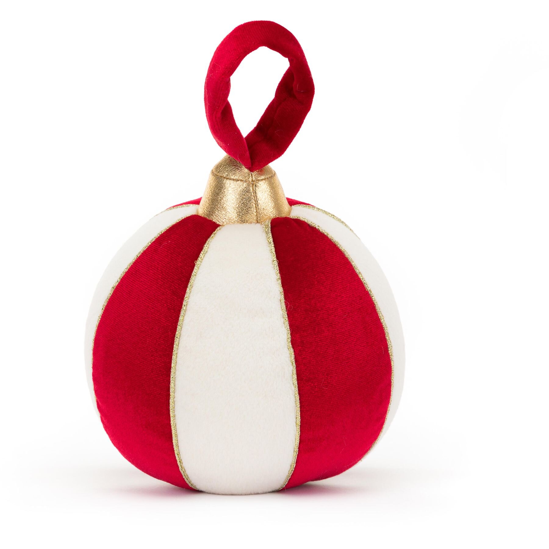 Amuseable Bauble features vibrant red and cream stripes with cordy brown booties. Who's this on the Christmas tree? It must be Amuseable Bauble! This jolly ball has cream and cranberry segments, with a strong velour loop and soft golden top. Pop it onto a branch, turn on the fairy lights and watch it take the spotlight! 12x12x16cm
