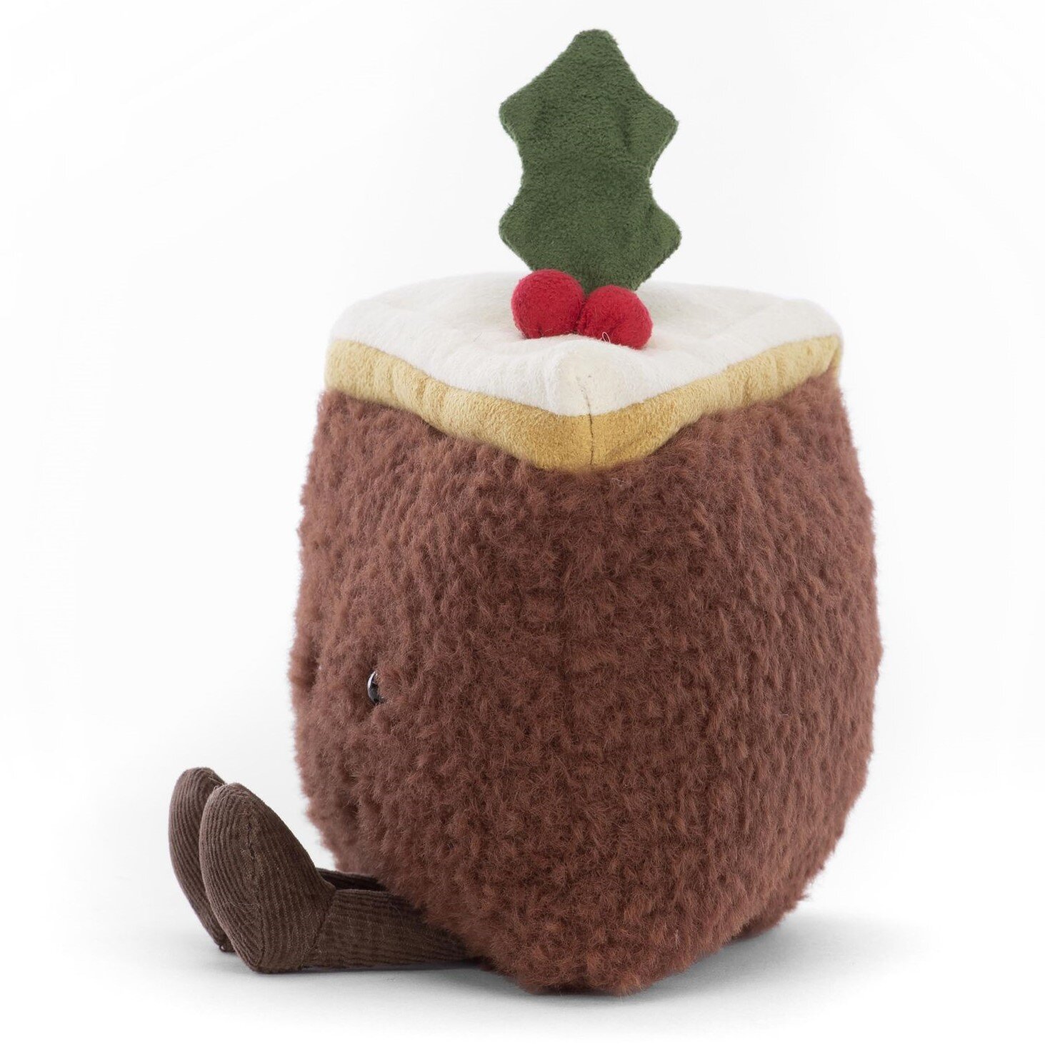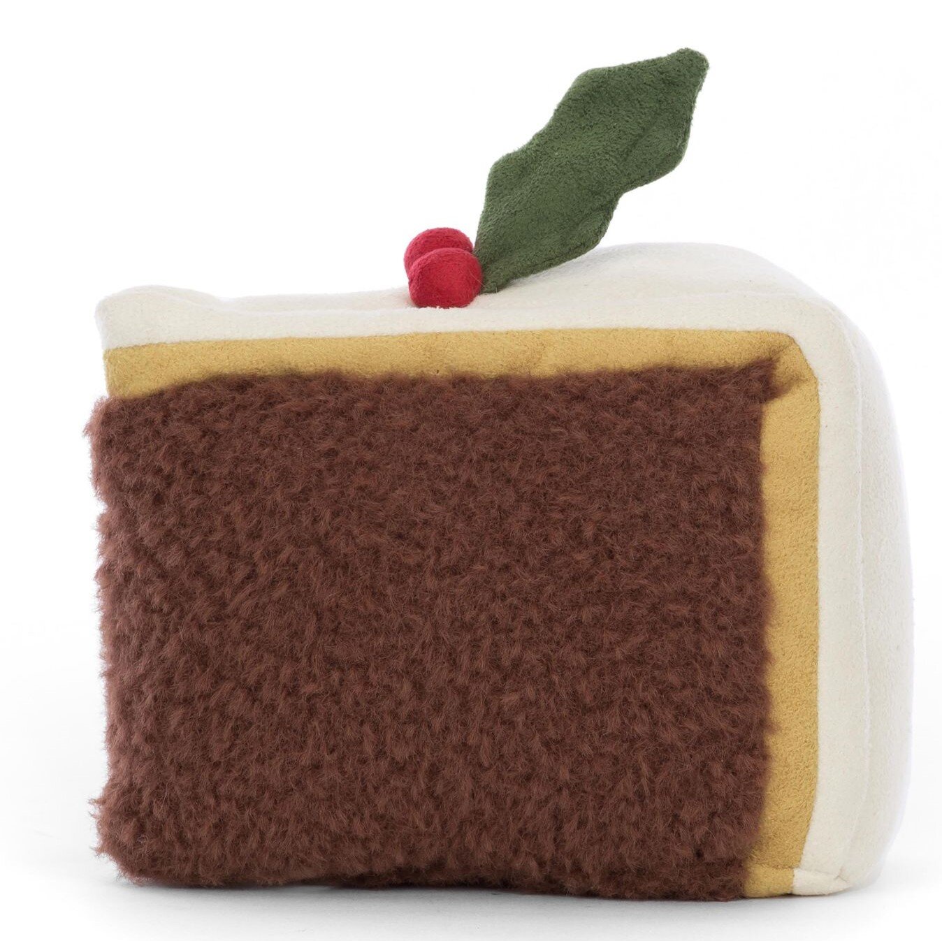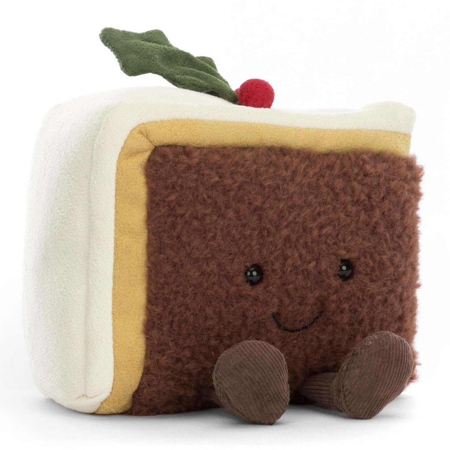 The Amuseable Slice of Christmas Cake is layers of fun! Sporting soft cream, suedey yellow, and rich cocoa fur. With a suedey holly hat and diddy cocoa legs. Amuseable Slice of Christmas Cake is a generous serving of fun! This splendid wedge of tufty brown cake has suedette marzipan and icing, topped with a perky holly sprig. With twinkling eyes, a stitch smile and waggly raisin cord boots, this cake is a real celebration. 8x12x10cm