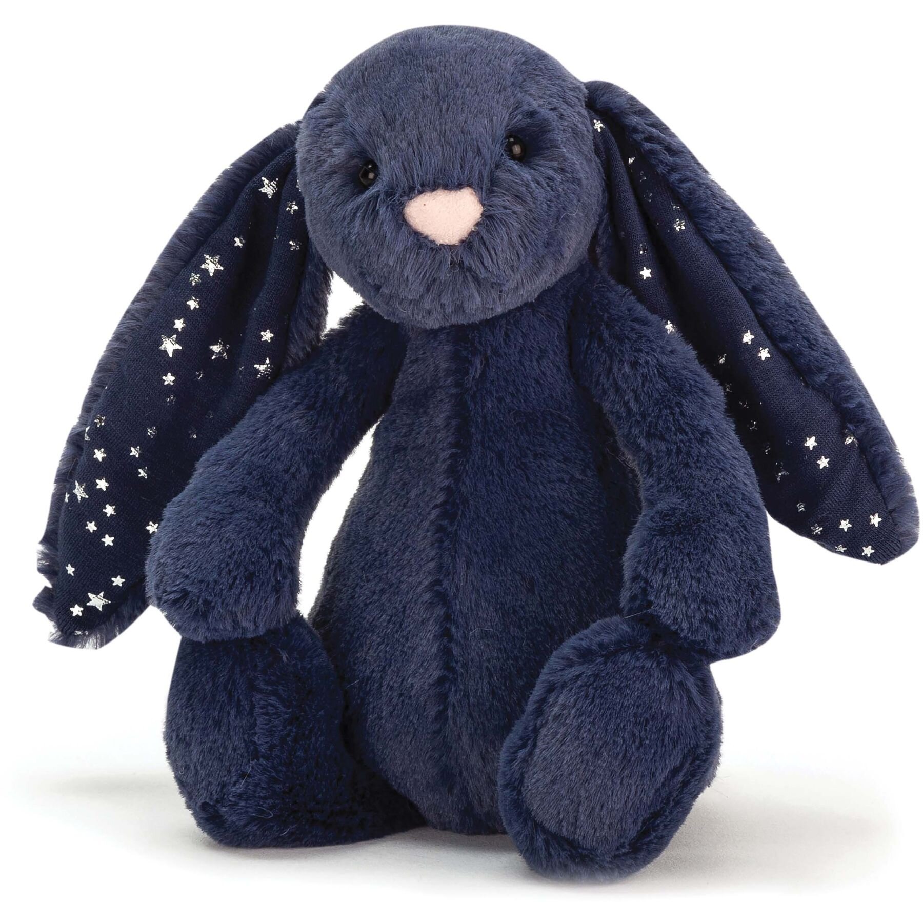 Bashful Stardust Bunny is a shy little sweetheart with yummy-soft midnight fur. Flopsy and gentle in deep navy blue, this bobble-nosed bunny loves bedtime so much. With sparkling ears full of twinkling silver stars, Bashful Stardust Bunny is a dreamy buddy.