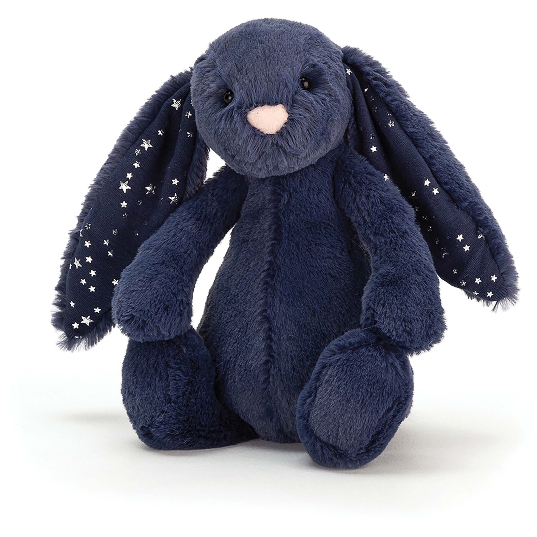 Bashful Stardust Bunny is a shy little sweetheart with yummy-soft midnight fur. Flopsy and gentle in deep navy blue, this bobble-nosed bunny loves bedtime so much. With sparkling ears full of twinkling silver stars, Bashful Stardust Bunny is a dreamy buddy.