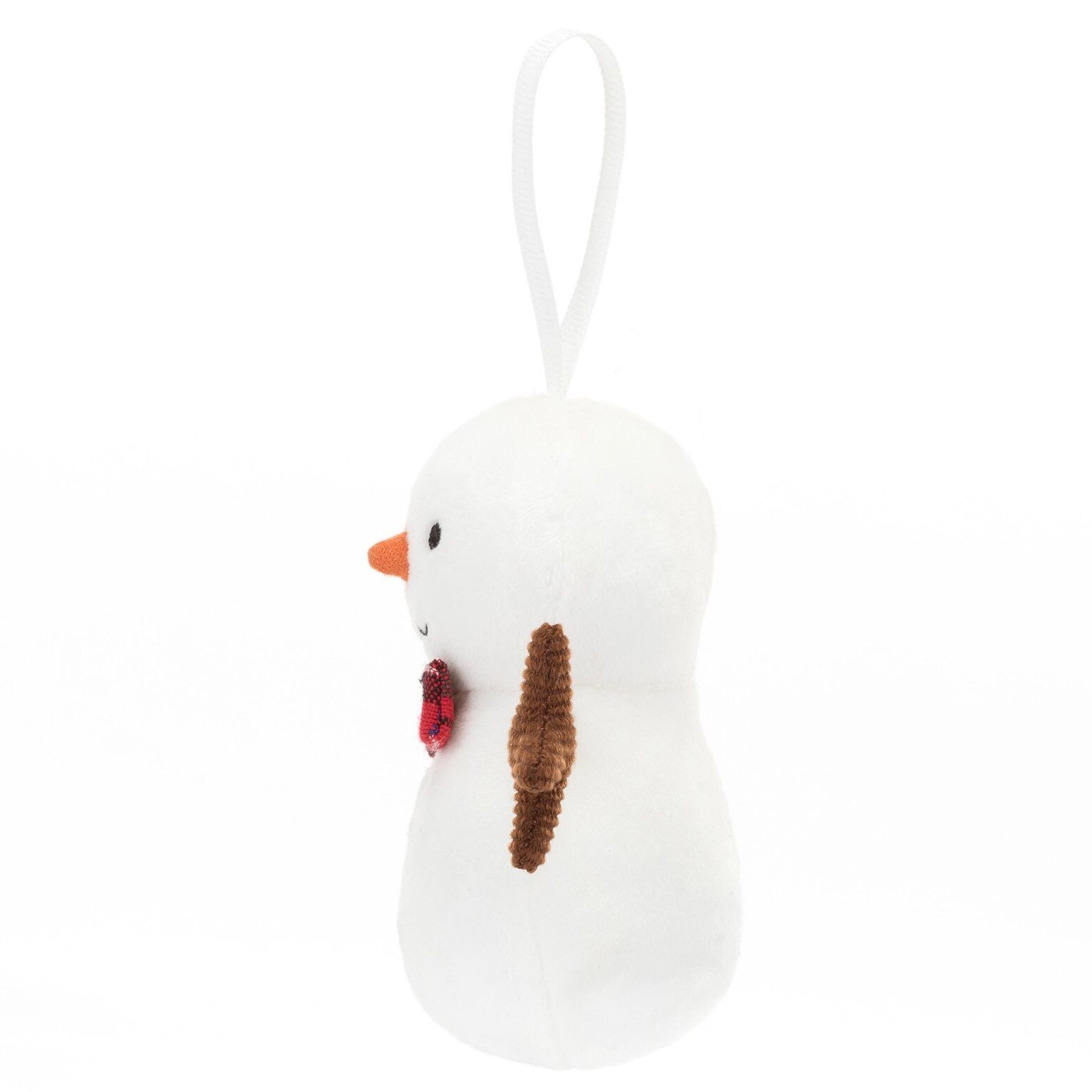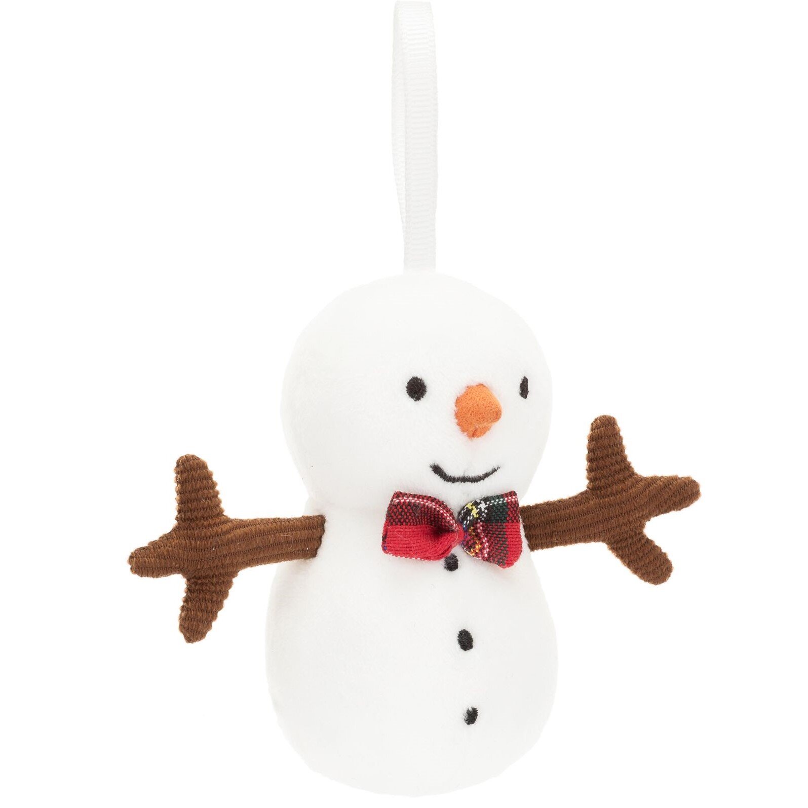 Festive Folly Snowman promises not to melt - even if you cuddle him very, very tight! This bobbly buddy is marshmallow-soft with cordy stick arms and a suedey carrot nose. Festive Folly Snowman is marshmallow-soft in gentle cream fur. This playful tree pal has a tartan bow-tie, stitched coal buttons and suedette carrot nose. With a snowy ribbon for hanging on the tree and chocolate cord arms held wide for hugs, this snowman is anything but frosty!5x6x9cm