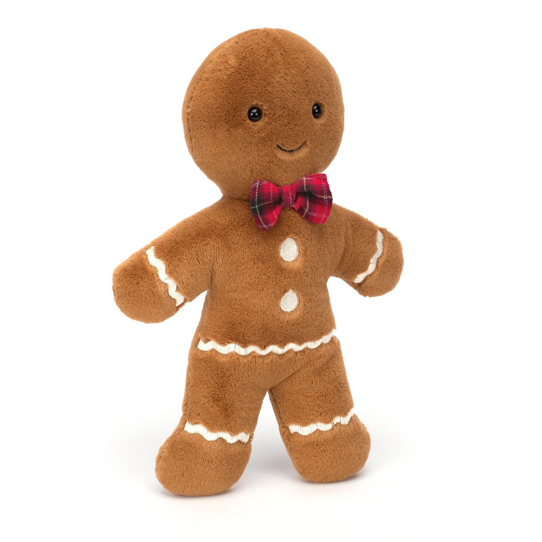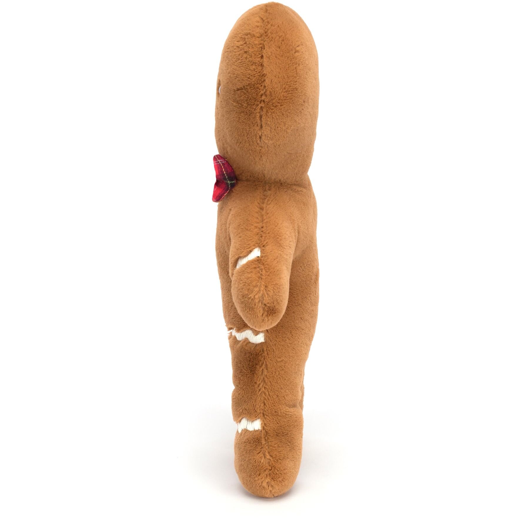 Festive Folly Gingerbread Fred is a jolly gingerbread. Featuring spice ginger plush and dashing red bow tie and cream stitchy buttons. Jolly Gingerbread Fred may have hopped straight out of the tin, but this guy's always looking smart! In soft golden biscuit fur with scalloped stitch icing, embroidered buttons and a red tartan bow, Fred is a forever festive friend! 5x12x32