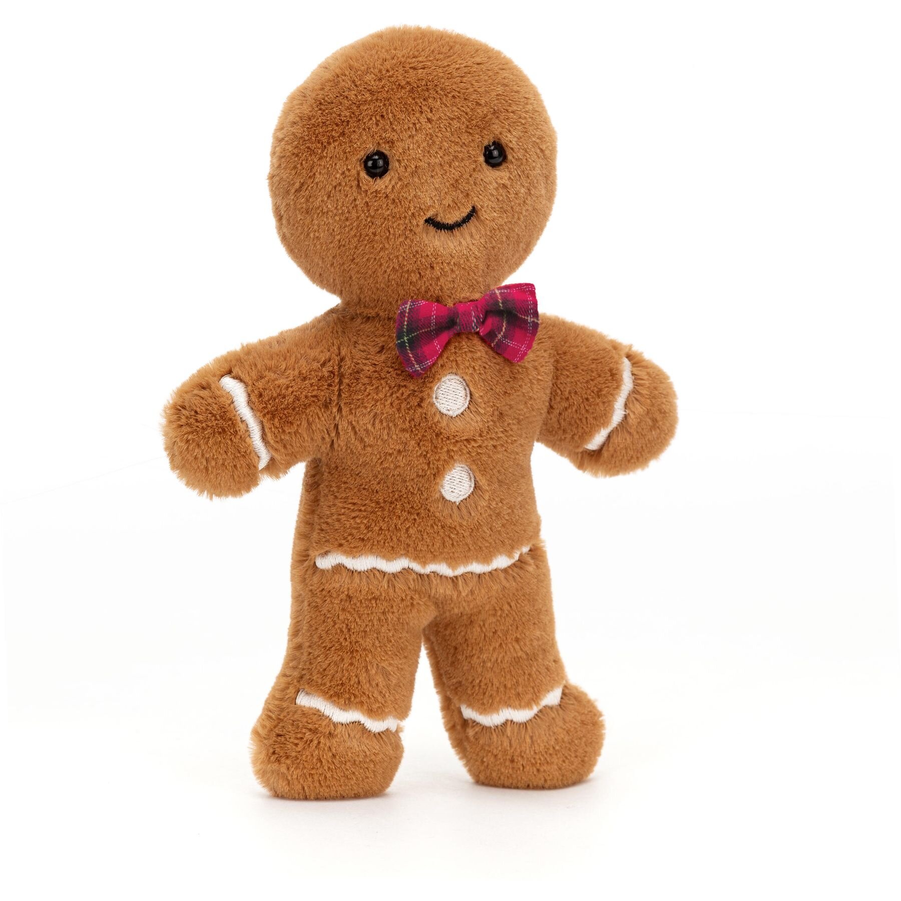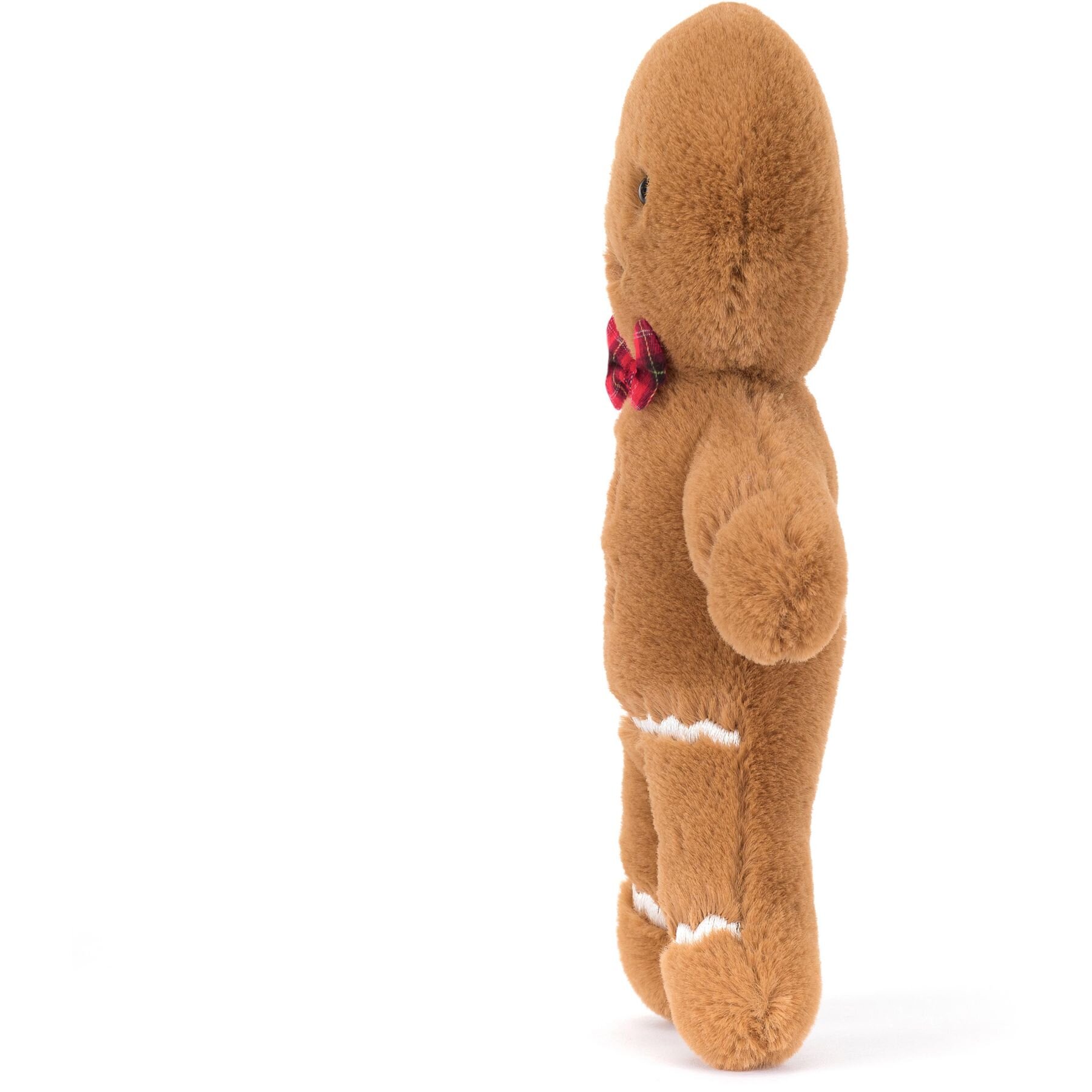 Festive Folly Gingerbread Fred is a jolly gingerbread. Featuring spice ginger plush and dashing red bow tie and cream stichy buttons. Jolly Gingerbread Fred may have hopped straight out of the tin, but this guy's always looking smart! In soft golden biscuit fur with scalloped stitch icing, embroidered buttons and a red tartan bow, Fred is a forever festive friend! 3x6x19cm