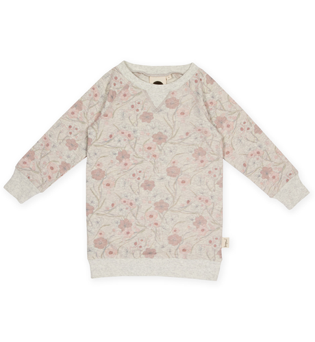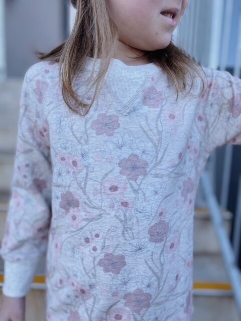 Floral print in lilac hues on Oatmeal marle french terry. Pairs well with our Rose Taupe rib story. Sweater dress.