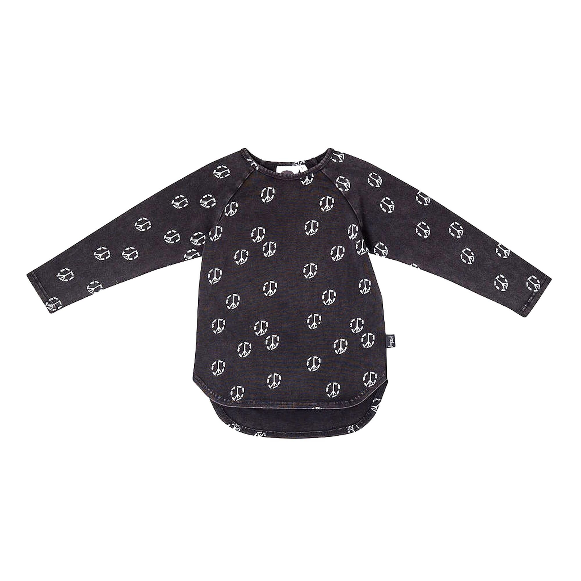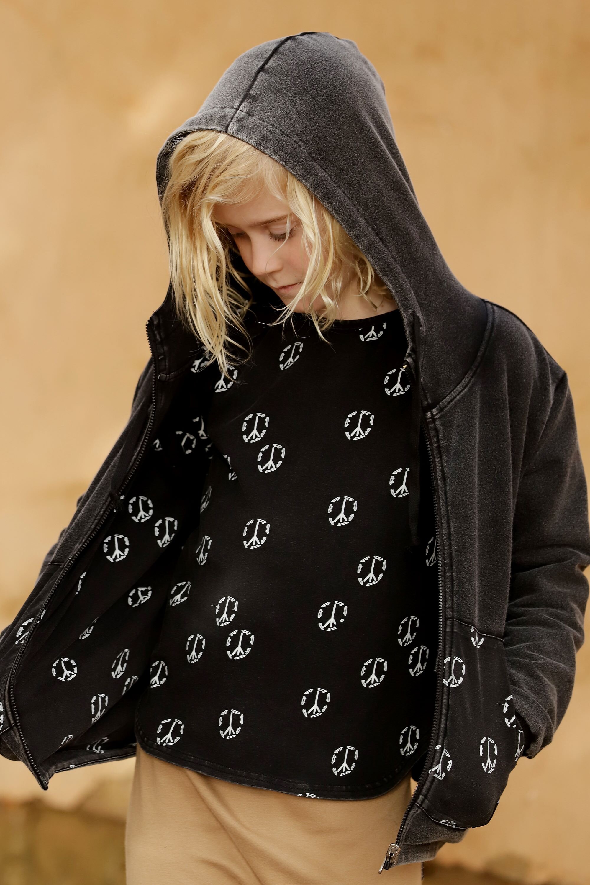 Faded black long sleeve t-shirt with an exclusive Nadia Flower Peace sign yardage made from skate boards – how cool! A great top for a boy that goes with everything. Features cool details like a Curved hemline and dipped hem at back.
